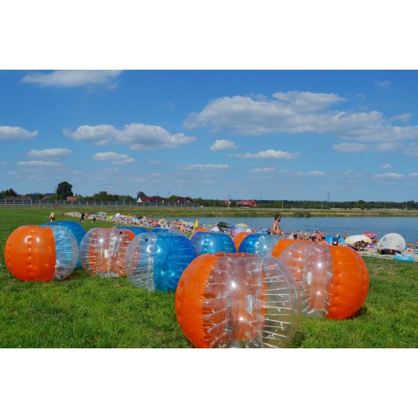 Bumper Ball TPU Premium to idealny wybór dla każdego, kto ceni wyzwania, aktywną grę zespołową i rywalizację! Choć grę w dmuchanych kulach kochają najmłodsi, tę niebanalną atrakcję uwielbiają też dorośli. Co ważne, Bumper Ball są dostosowane praktycznie do każdego wzrostu. Nie musisz obawiać się siniaków czy otarć. Zastosowany materiał jest odporny na zderzenia z innymi. Najsolidniejsze z dmuchanych kul Bumper Ball TPU Premium dedykowane są grupom 10-osobowym lub większym. Taka liczba uczestników pozwala stworzyć dwie drużyny i rozegrać mecz. Chętnie wybierają je organizatorzy imprez plenerowych dla dzieci i dorosłych: festynów, dni miasta, pikników rodzinnych, a także eventów firmowych i imprez integracyjnych. To też doskonały pomysł na prywatną imprezę, na przykład urodziny, wieczór kawalerski lub panieński, zjazd rodzinny itp. Dmuchane kule Bumper Ball to bezpieczna rozrywka na najwyższym poziomie. Zabawa drużynowa w dmuchanych zapewni radość i mnóstwo zabawy na wiele godzin!