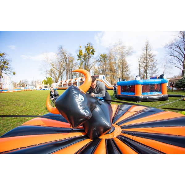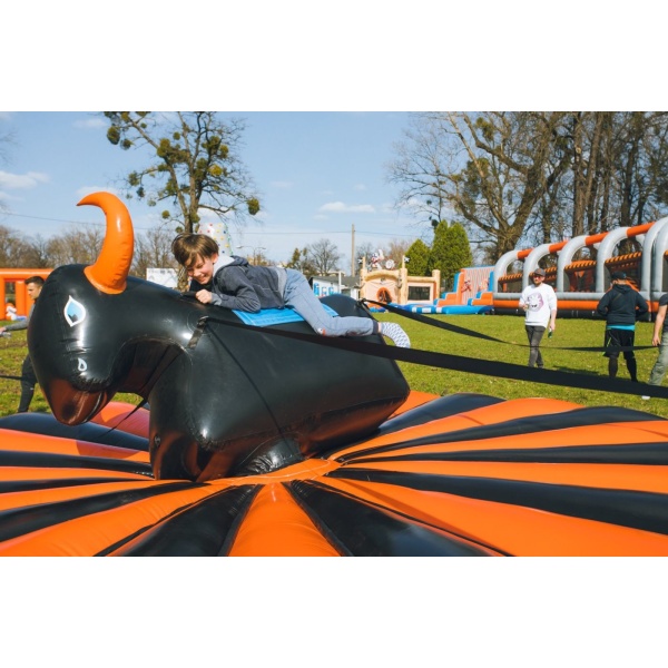 Dmuchany byk - Rodeo Bull to atrakcja dmuchana, która dedykowana jest dla wszystkich, którzy czują ducha konkurowania. Zabawa zaczyna się w momencie podjęcia rywalizacji z innymi uczestnikami rozgrywki. Poziom trudności wzrasta wraz ze stopniem zaawansowania i sprawności grupy przeciwnej. Dmuchaniec dostarcza mnóstwa emocji, ale jest to bezpieczna rywalizacja. Nie wymaga ponadprzeciętnej sprawności fizycznej. Niemal każdy może bawić się na dmuchańcu do rywalizacji. Dmuchany byk - Rodeo Bull może być używany na otwartej przestrzeni, ale również w hali sportowej - czyli przez cały rok.