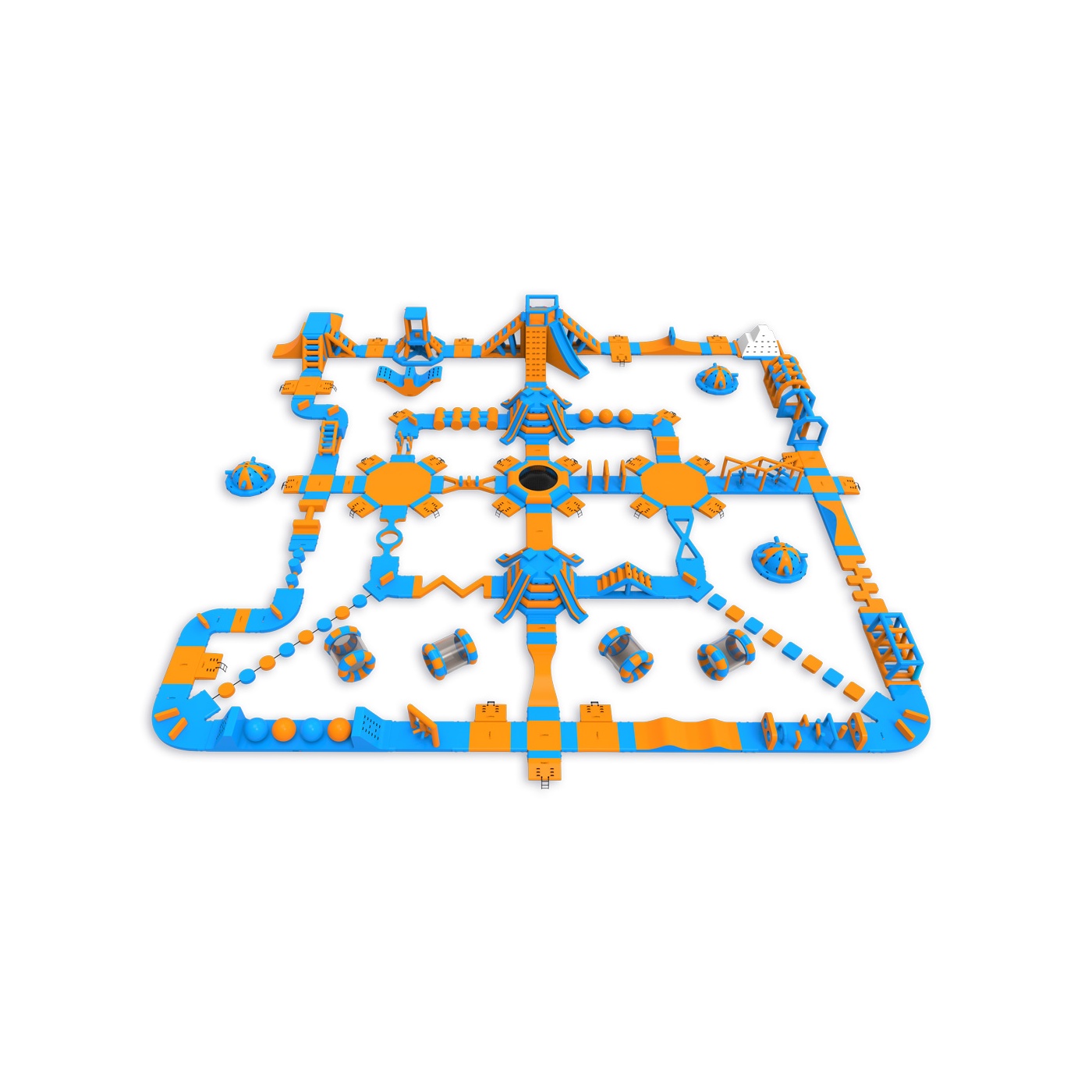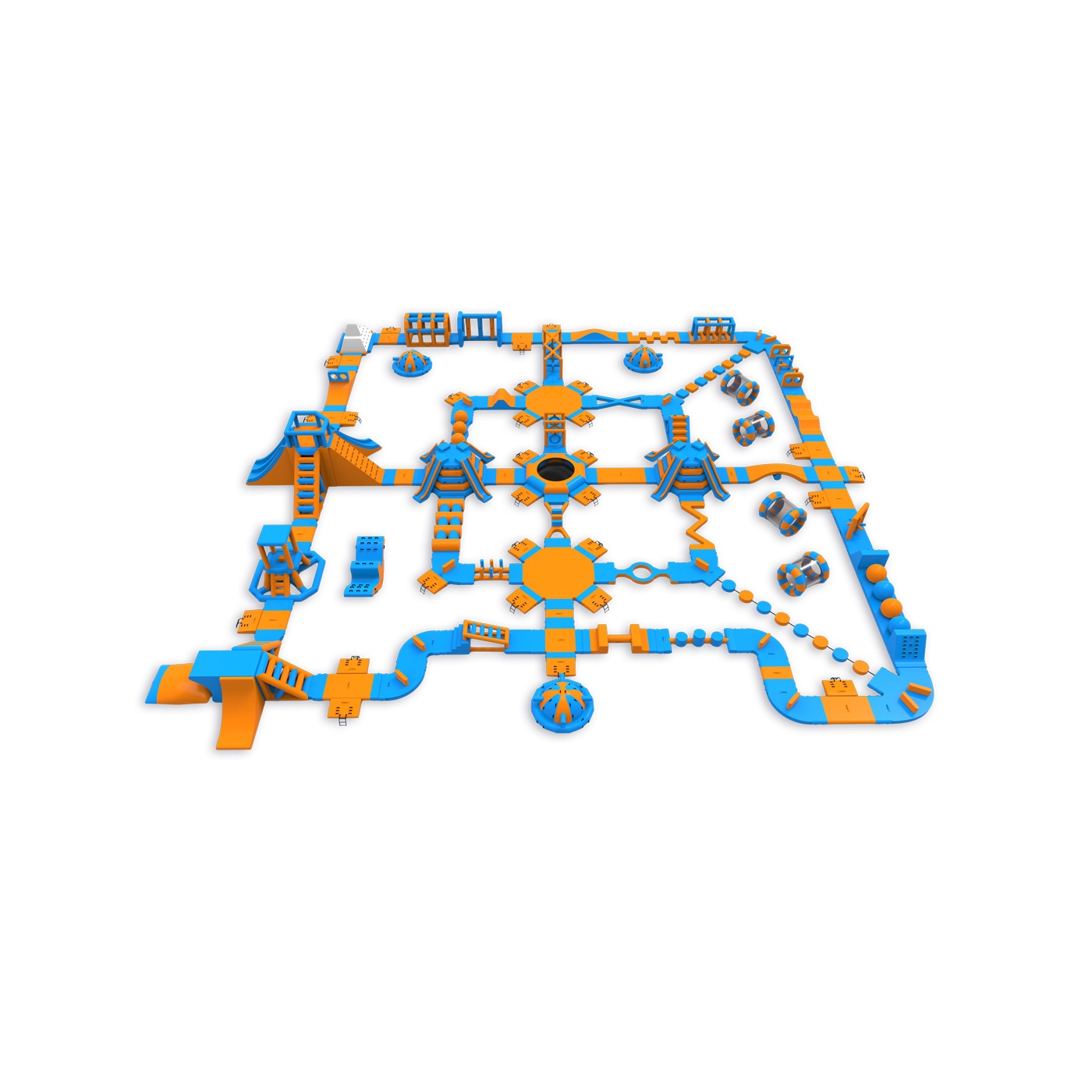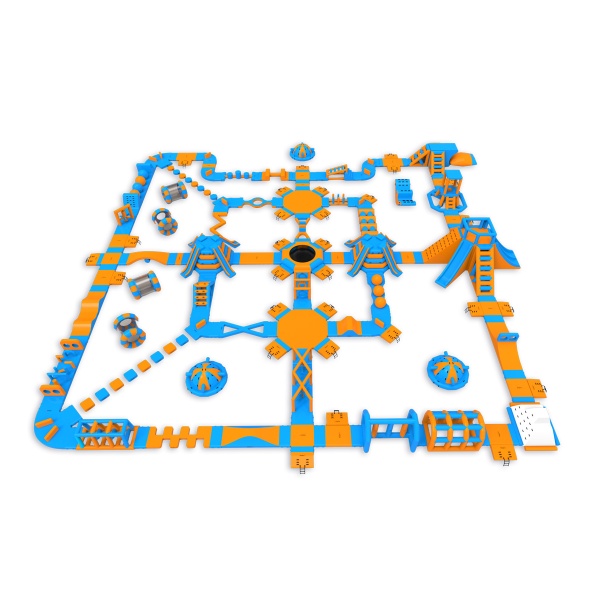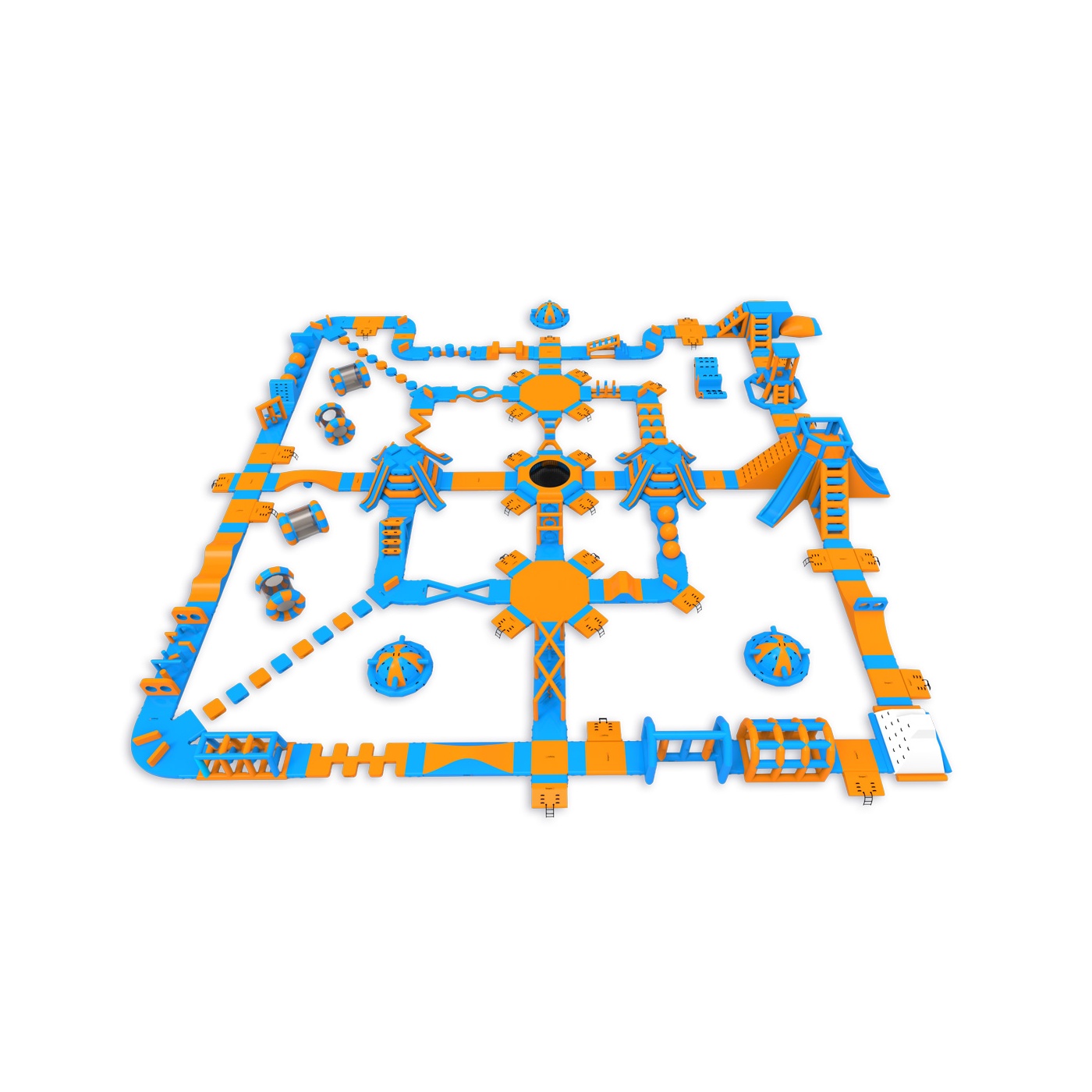 Największy park wodny w ofercie Gangaru. 2 704 m² powierzchni, symetryczny układ i centralny węzeł komunikacyjny - to konstrukcja zaprojektowana z myślą o dużym ruchu i sprawnej obsłudze uczestników. Zróżnicowane strefy atrakcji - zjeżdżalnie, platformy do skoków, elementy wspinaczkowe i ścieżki przeszkód - pozwalają jednocześnie obsłużyć wiele grup wiekowych. Sigma sprawdza się wszędzie tam, gdzie liczy się skala: duże akweny, ośrodki wypoczynkowe, imprezy masowe.