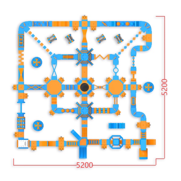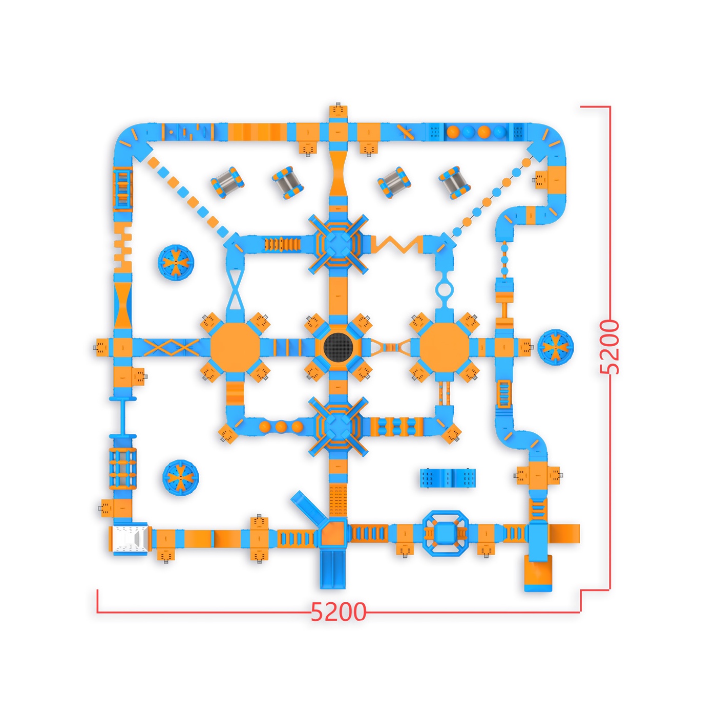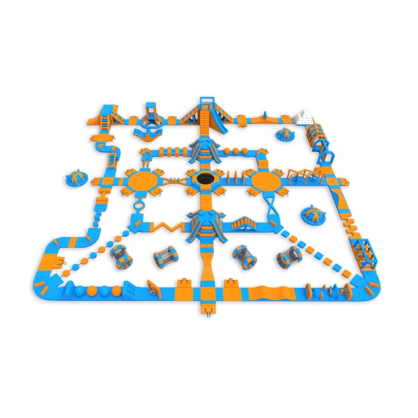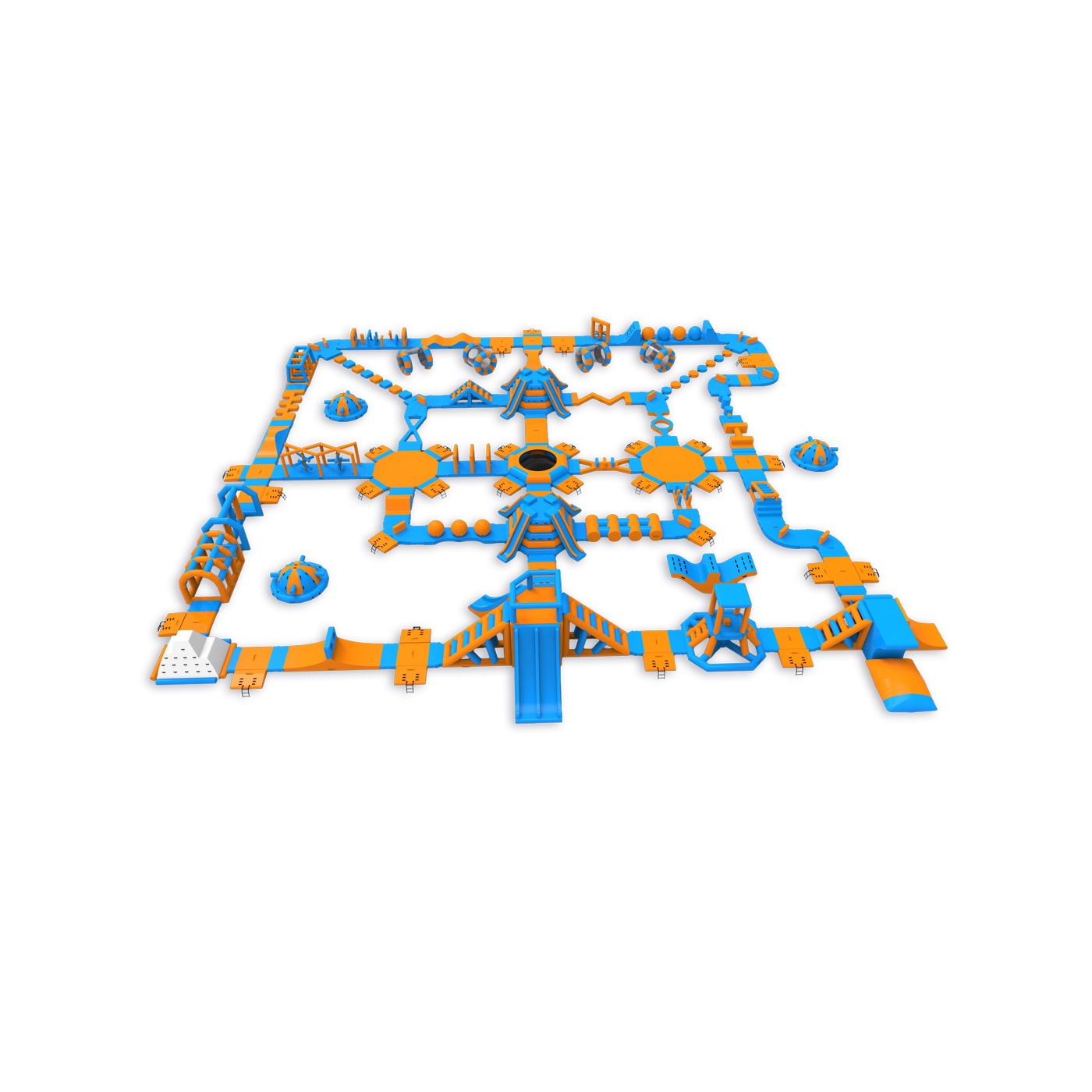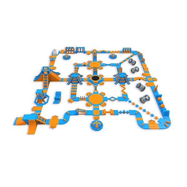 Największy park wodny w ofercie Gangaru. 2 704 m² powierzchni, symetryczny układ i centralny węzeł komunikacyjny - to konstrukcja zaprojektowana z myślą o dużym ruchu i sprawnej obsłudze uczestników. Zróżnicowane strefy atrakcji - zjeżdżalnie, platformy do skoków, elementy wspinaczkowe i ścieżki przeszkód - pozwalają jednocześnie obsłużyć wiele grup wiekowych. Sigma sprawdza się wszędzie tam, gdzie liczy się skala: duże akweny, ośrodki wypoczynkowe, imprezy masowe.