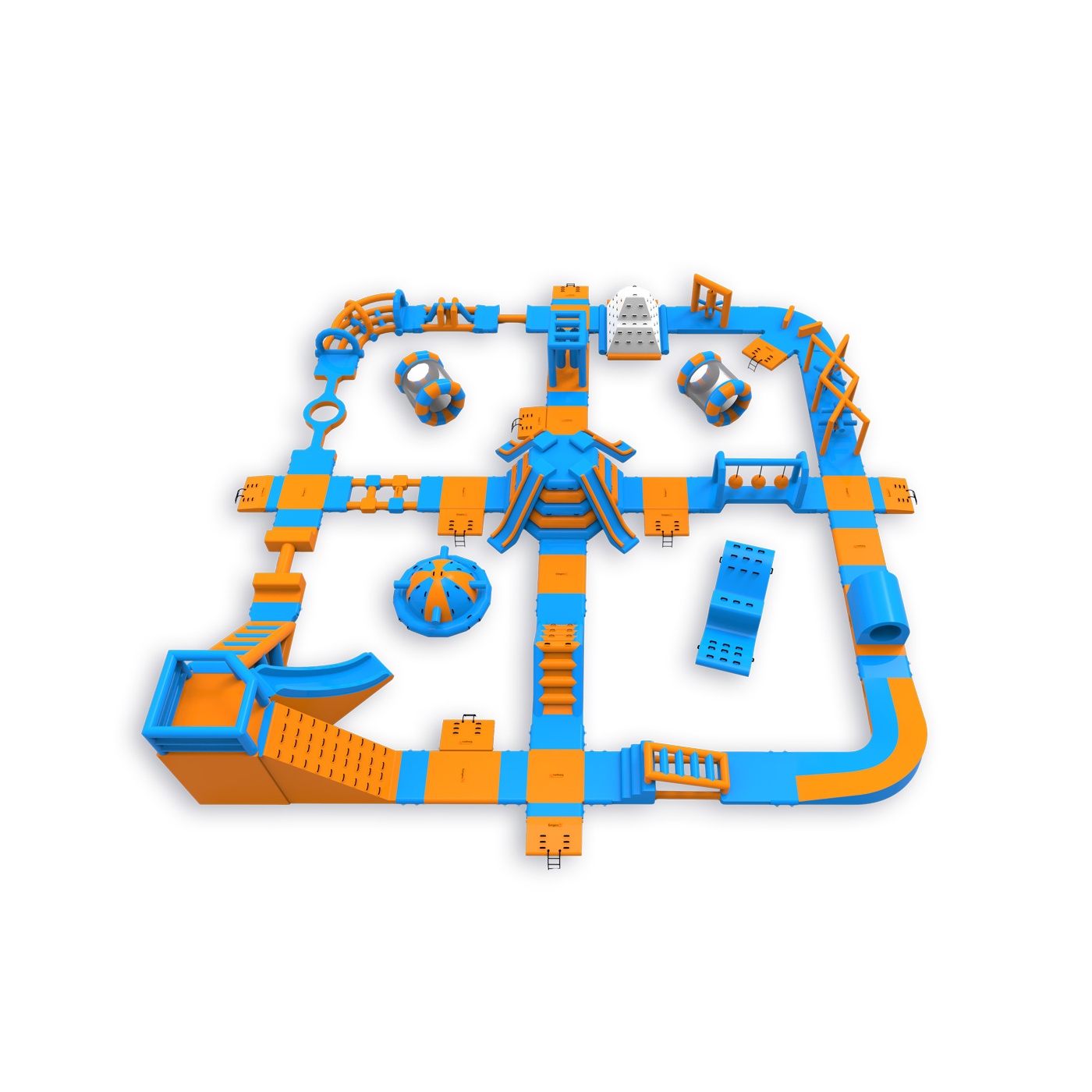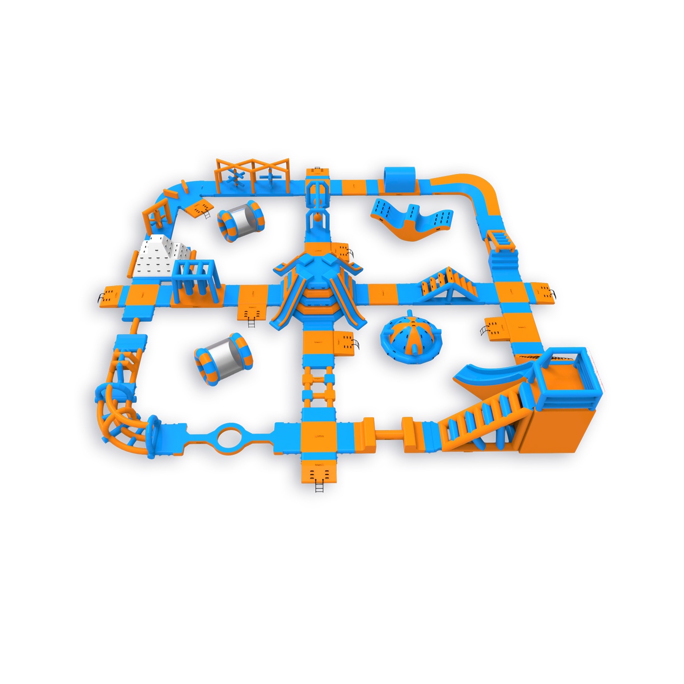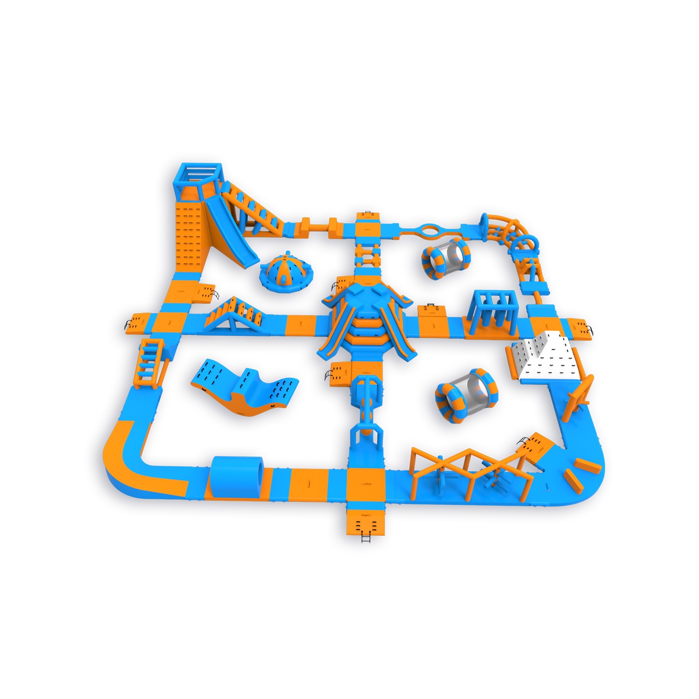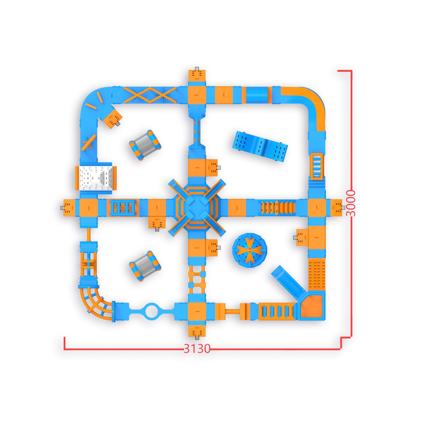 Wysoka wieża narożna ze wspinaczką i zjeżdżalnią - to element, który wyróżnia Pi spośród parków w tej klasie wielkości. W centrum czeka konstrukcja z czterema zjeżdżalniami, a na trasie znajdziesz m.in. białą ściankę wspinaczkową, kule, kołowrotki, mostki i równoważnie. Układ z centralnym węzłem i obwodową ścieżką przeszkód daje właścicielowi pełną kontrolę nad przepływem nawet 90-osobowej grupy. Sprawdza się na średnich akwenach, gdzie liczy się maksymalne wykorzystanie dostępnej powierzchni.