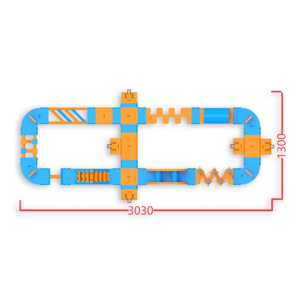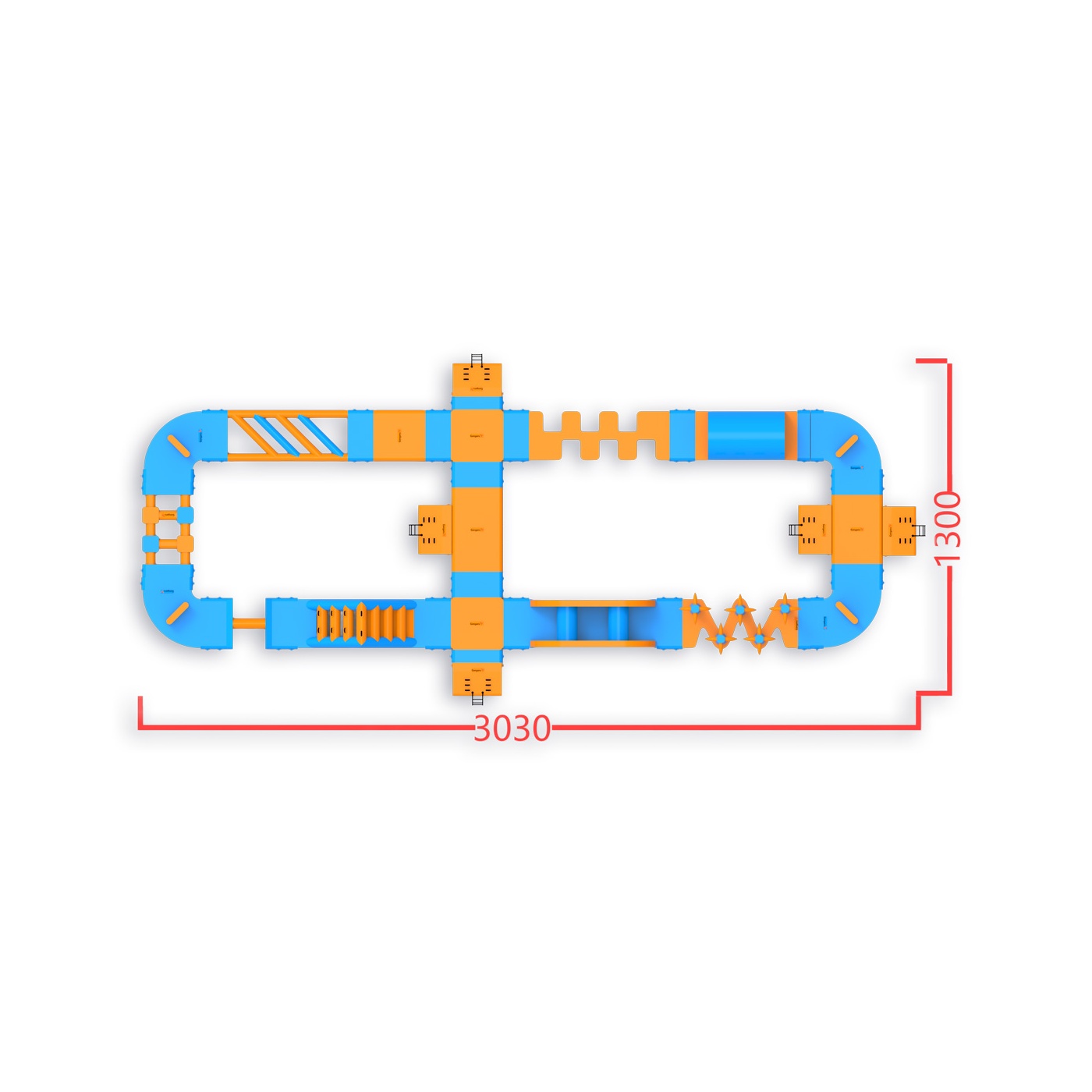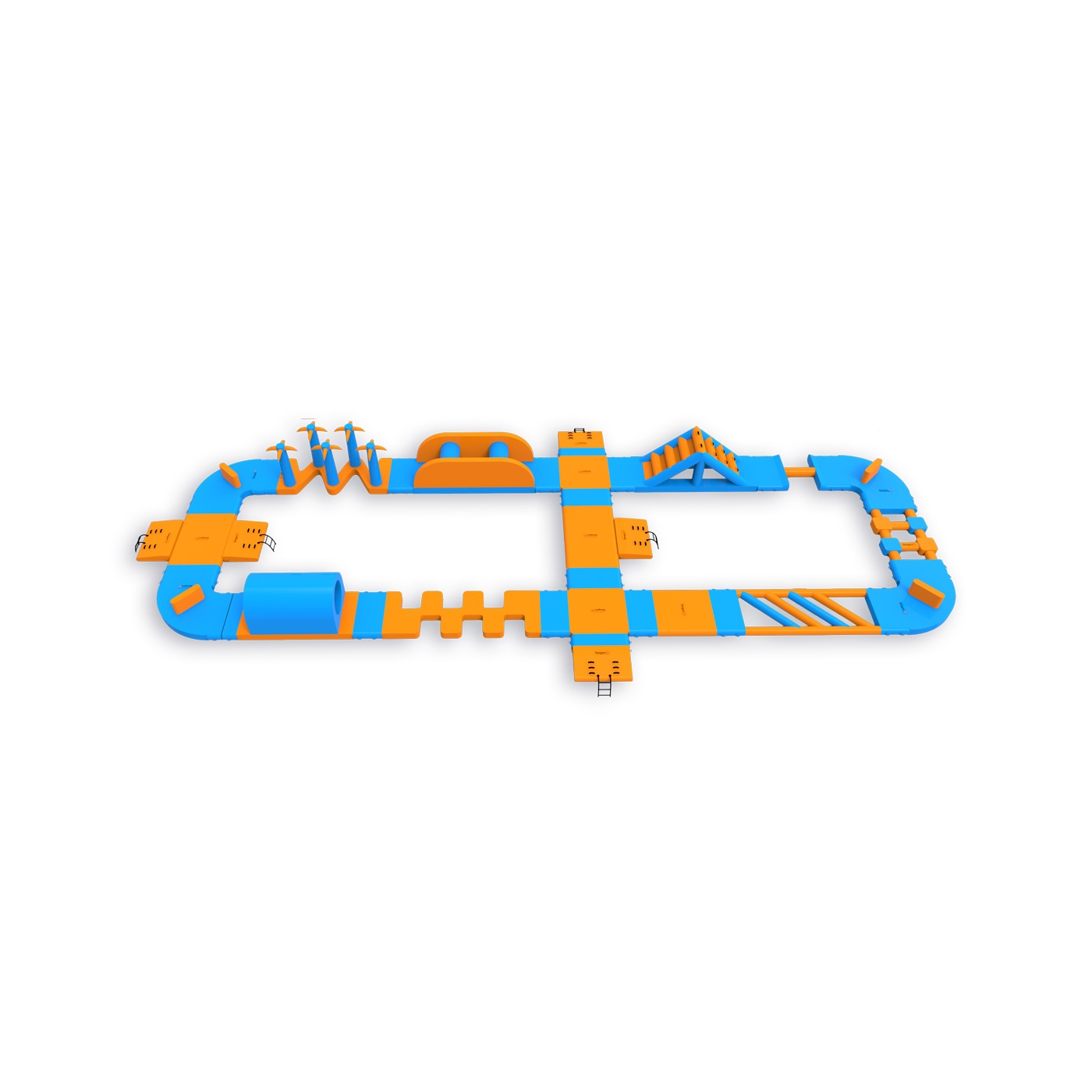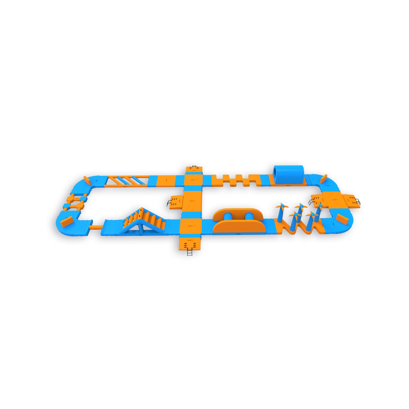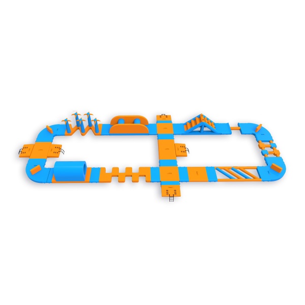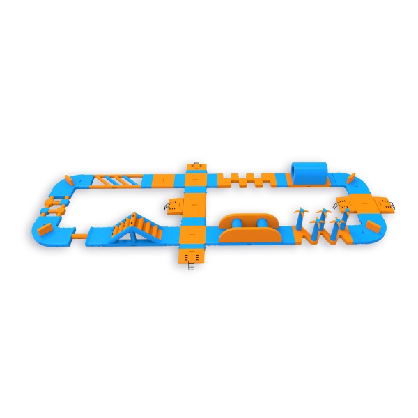 Trasa, którą chce się pokonać jeszcze raz. Schody, elementy wspinaczkowe, zygzaki, platformy i charakterystyczna przeszkoda z palmami tworzą wydłużony układ 390 m² - idealne rozwiązanie dla akwenów o ograniczonej szerokości, gdzie liczy się długość trasy i dostępność atrakcji dla szerokiego przekroju gości.