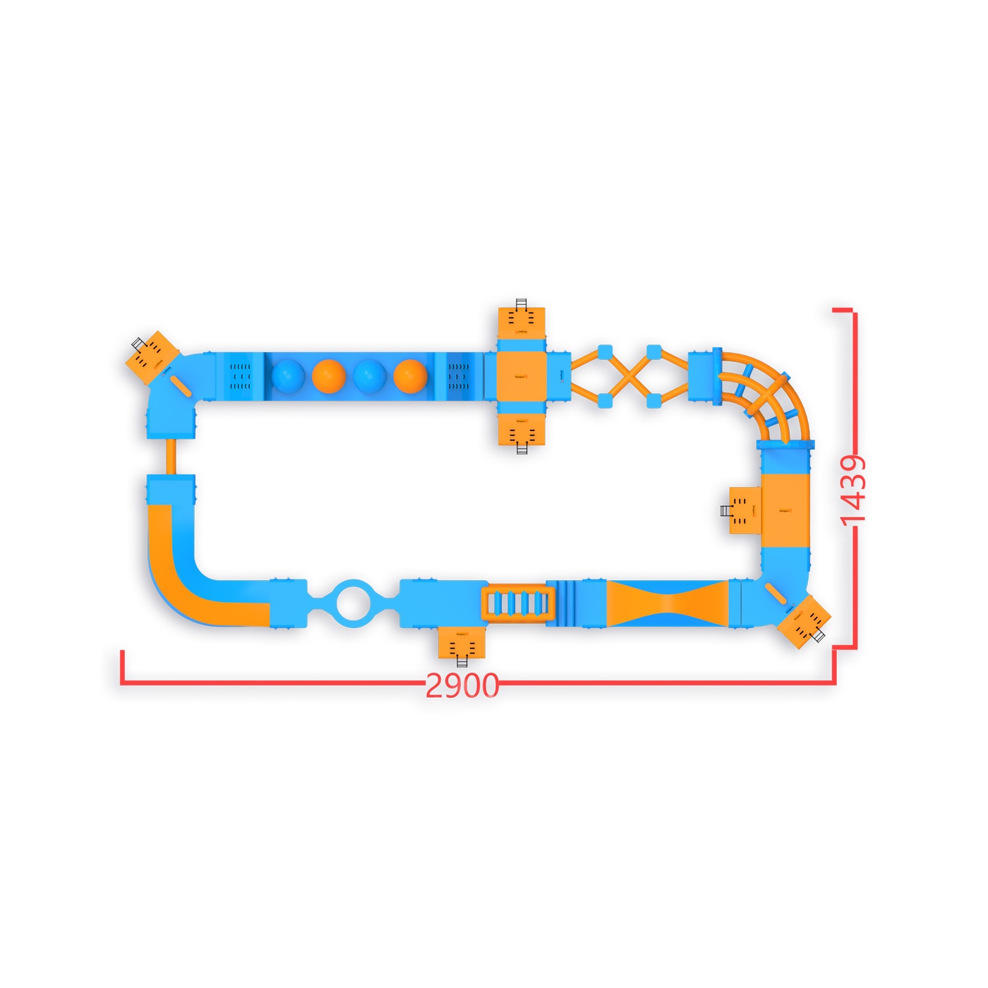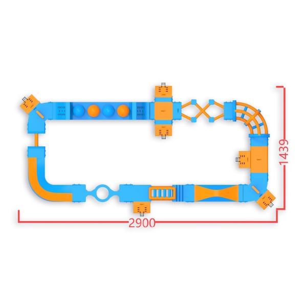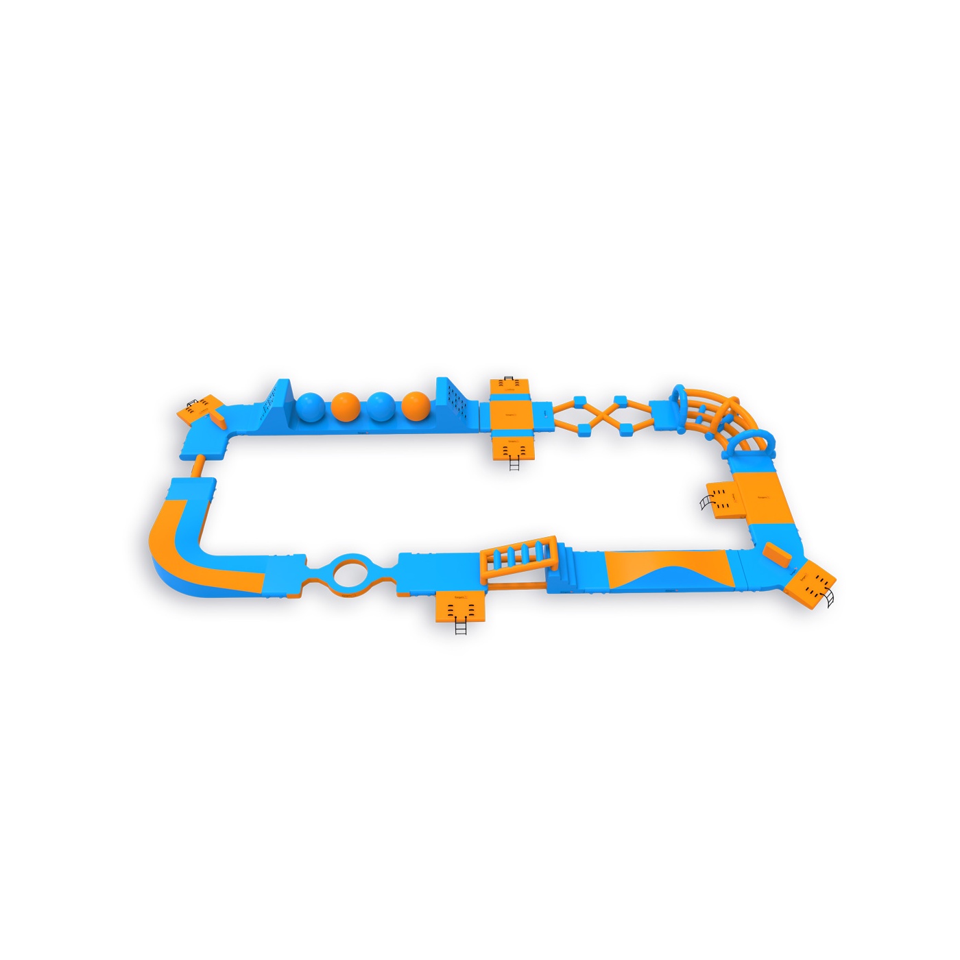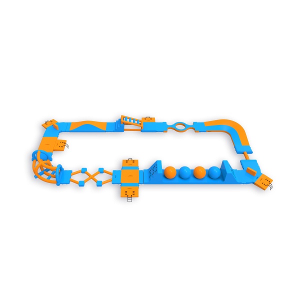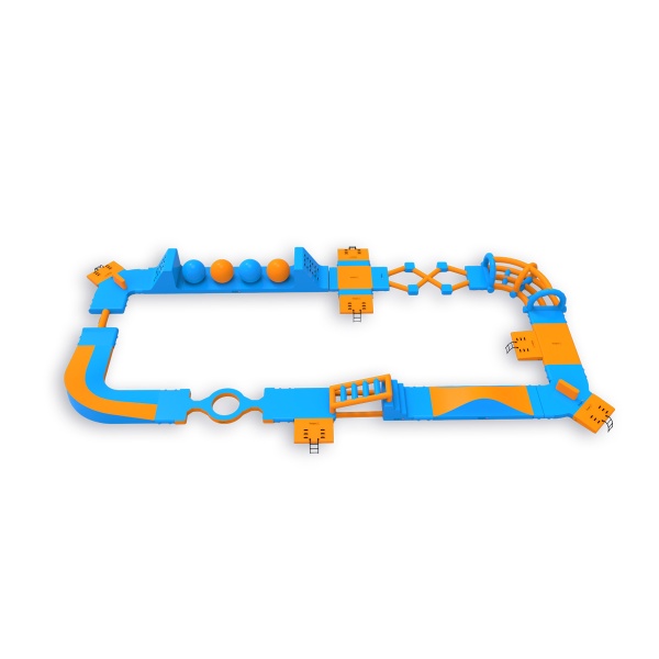 Cztery kule Wipeout z platformami do skoków - element, który zatrzymuje uczestników na dłużej i zachęca do kolejnych podejść. Obwodowy układ 406 m² z płotkami, schodami i elementami równoważnymi prowadzi przez kolejne strefy aktywności, zapewniając naturalny przepływ grupy do 40 osób jednocześnie. Sprawdza się na średnich akwenach, gdzie liczy się dostępność atrakcji dla szerokiego przekroju gości i wysoka rotacja przez cały dzień.