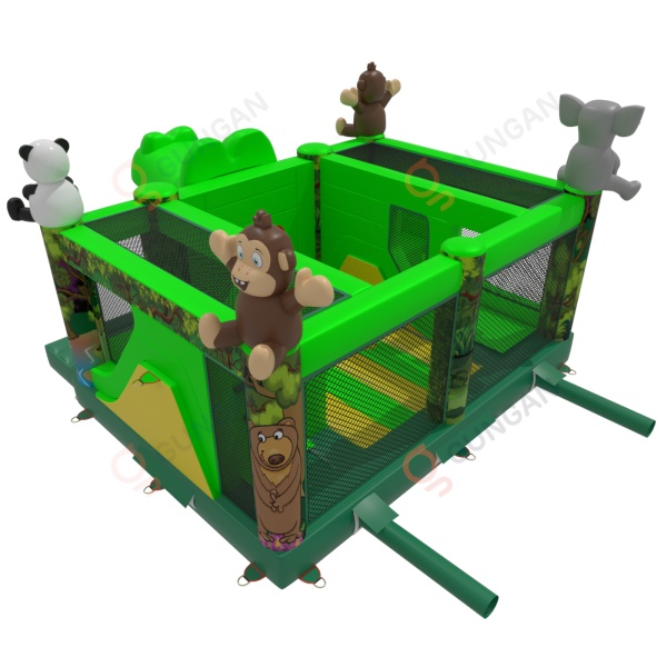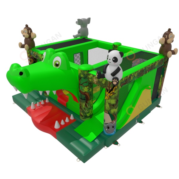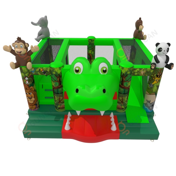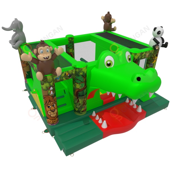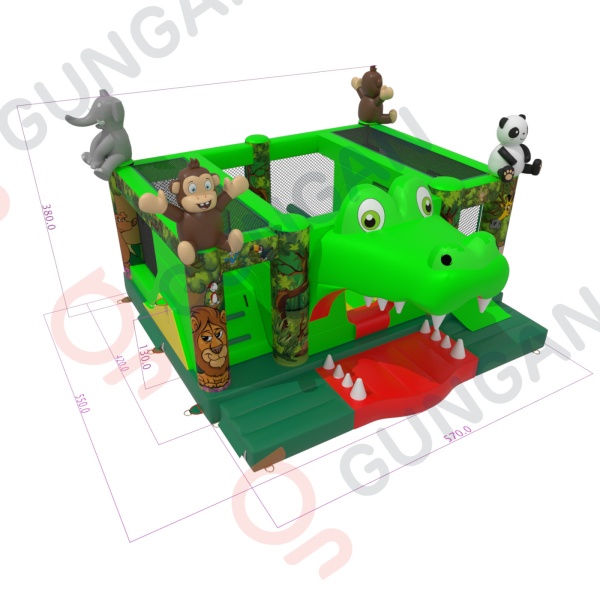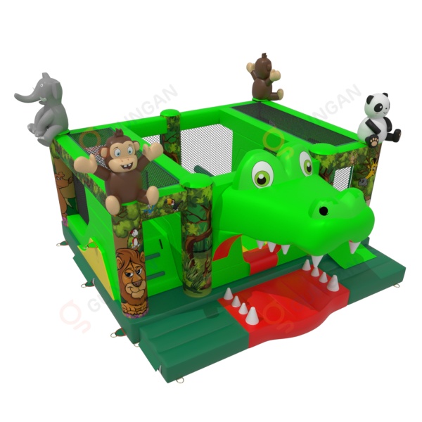 Dmuchany plac zabaw "krokodyl" w motywie dżungli dedykowany jest głównie dla dzieci, które poszukują przygody w czasie zabaw z przyjaciółmi i rówieśnikami. Dmuchany plac zabaw jest ogrodzony i miękki, a dzięki temu całkowicie bezpieczny podczas użytkowania. Zwykle składa się z dużej oraz małej zjeżdżalni, dlatego dzieci w różnym wieku będą się na nim świetnie bawić.Dmuchany plac zabaw "krokodyl" w motywie dżungli bardzo dobrze sprawdzi się na piknikach rodzinnych, imprezach integracyjnych i pracowniczych czy eventach innego rodzaju – w plenerze i nie tylko. Dmuchane place zabaw są doskonałą alternatywą dla większych i bardziej wymagających dmuchańców. Szczególnie polecamy tę atrakcję w przypadku rozpoczęcia biznesu.