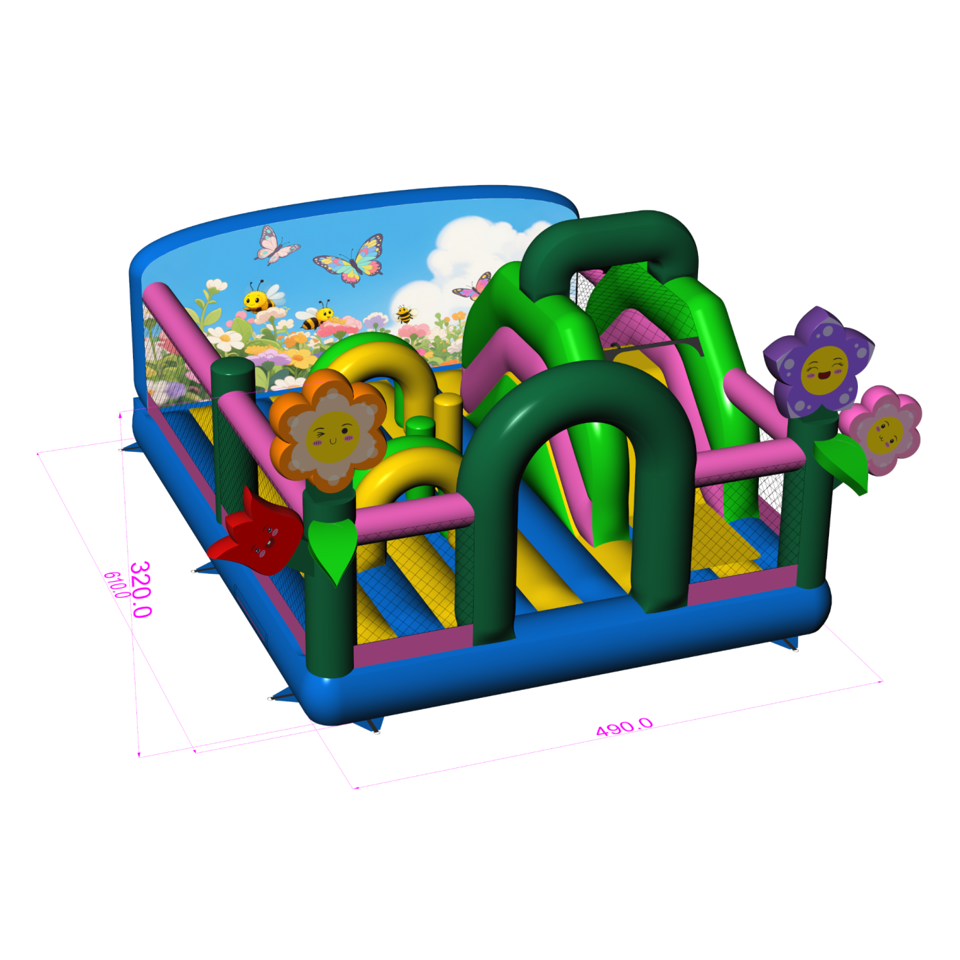 Dmuchany plac zabaw 6x5 w motywie wiosennym to wyjątkowo urocza propozycja dla wypożyczalni, które szukają atrakcji na pikniki rodzinne, festyny i imprezy plenerowe. Barwne motywy kwiatów, motyli i uśmiechniętych postaci budują pozytywny nastrój i przyciągają najmłodszych. Plac zabaw zawiera przeszkody, tunel oraz zjeżdżalnię, zapewniając dzieciom urozmaiconą zabawę na bezpiecznej nawierzchni. Konstrukcja pozwala na szybką rotację graczy, dzięki czemu świetnie sprawdza się przy dużej frekwencji. Wzbogać swoją ofertę o motyw, który wywołuje uśmiech już od pierwszego spojrzenia.