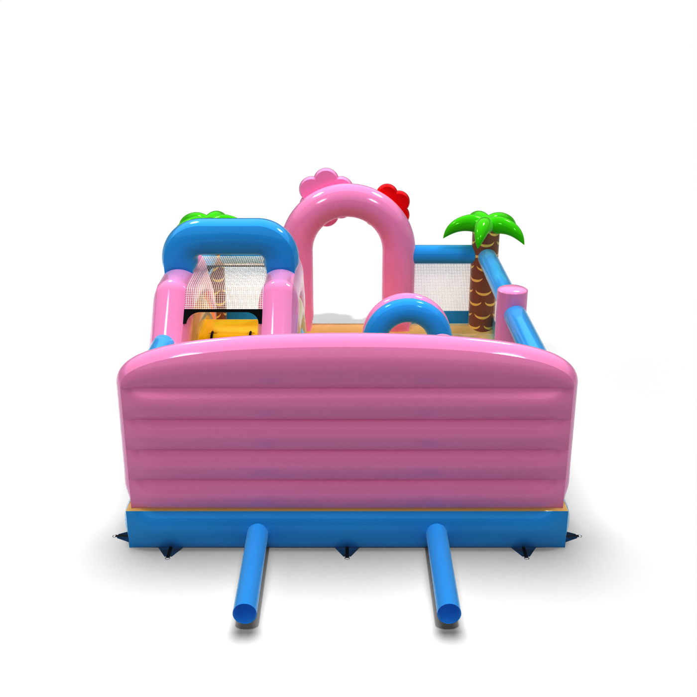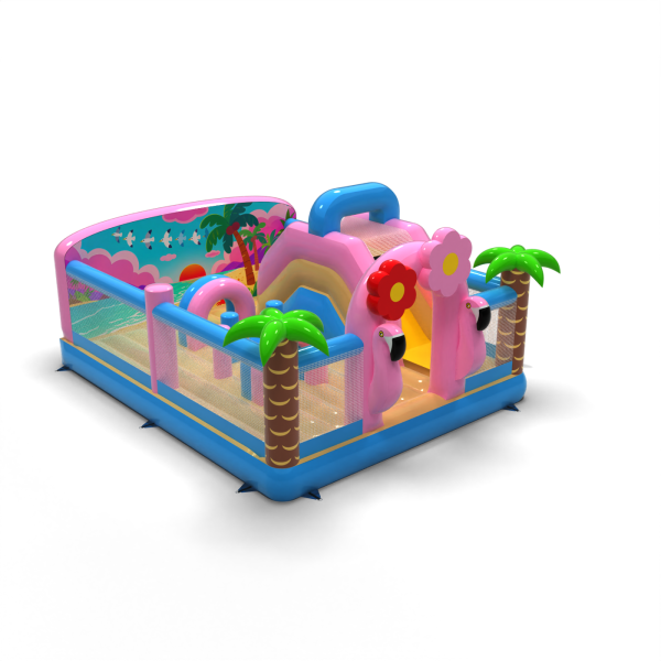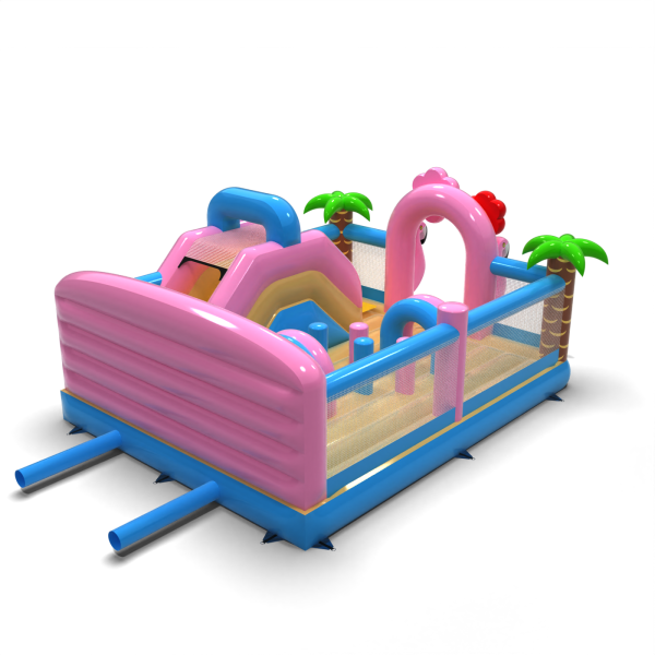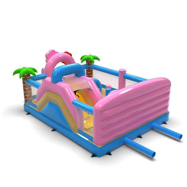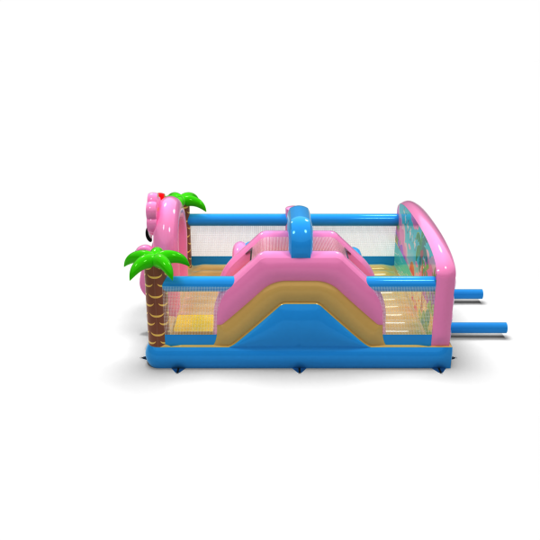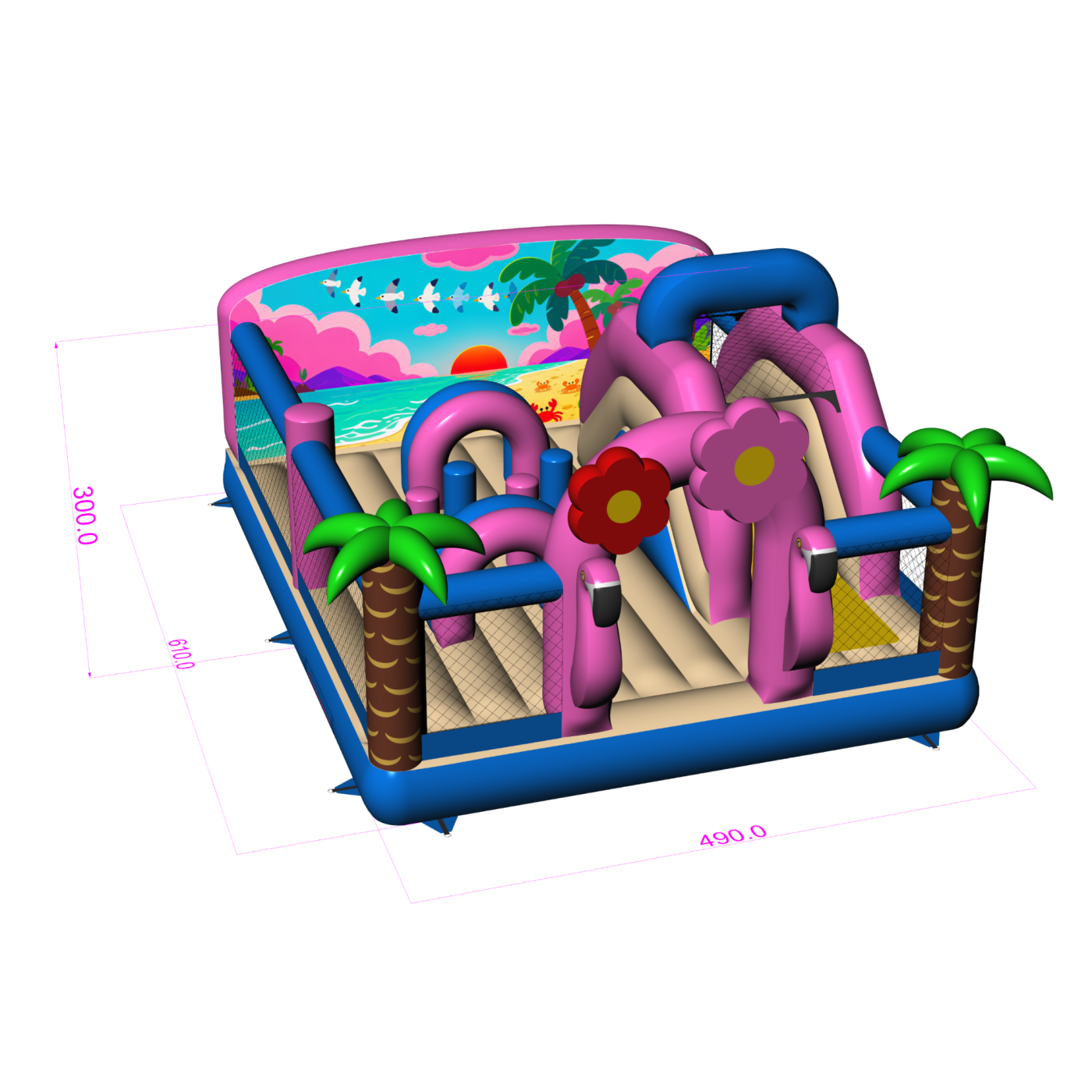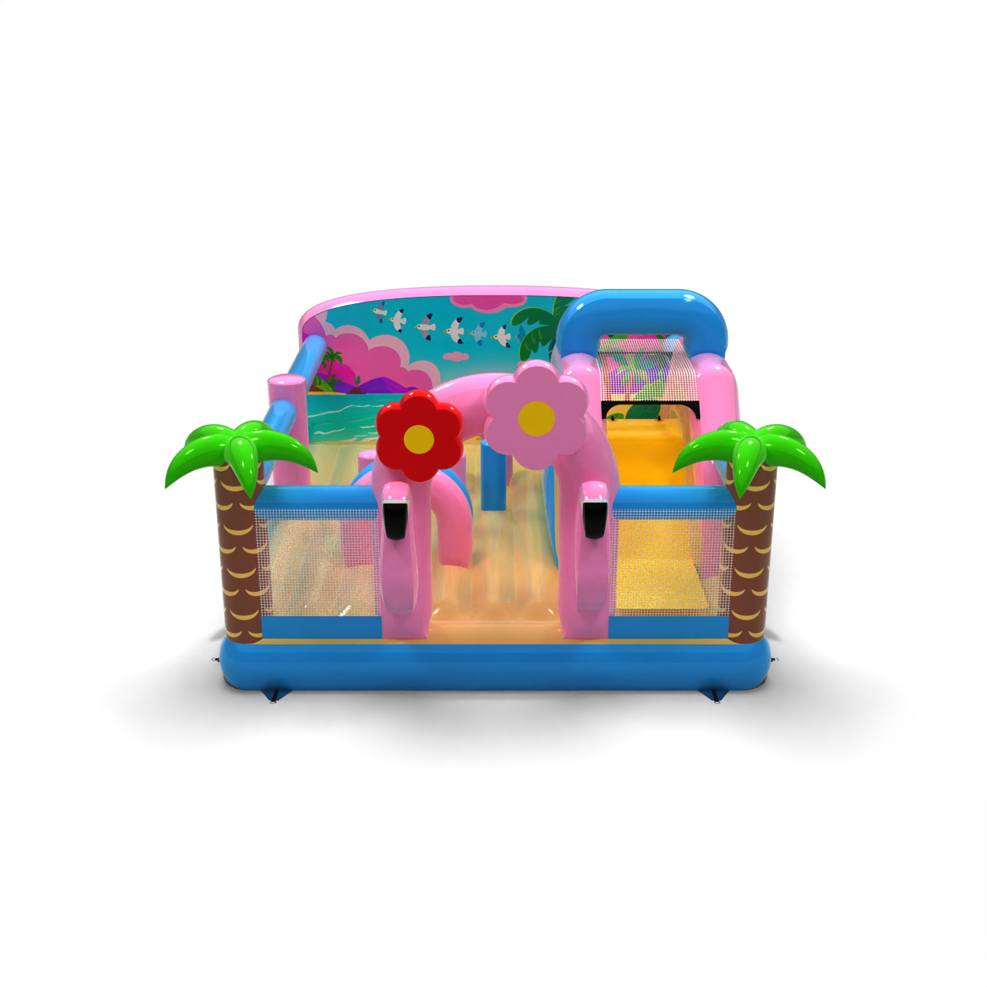 Dmuchany plac zabaw 6x5 w motywie hawajskim to propozycja dla wypożyczalni i organizatorów eventów, którzy chcą przyciągnąć uwagę kolorową, egzotyczną atrakcją. Różowe flamingi, palmy i wakacyjna scenografia tworzą klimat tropikalnej przygody, która wyróżnia strefę dziecięcą i zachęca do zabawy. Konstrukcja łączy klasyczne elementy zabawy – tunel, zjeżdżalnię i przeszkody – z bezpieczną, przewiewną przestrzenią. Dzięki kompaktowym rozmiarom i dużej powierzchni do zabawy atrakcja idealnie sprawdza się w miejscach z dużą rotacją uczestników. Wzbogać swoją ofertę o motyw, który rozbudza wyobraźnię i przyciąga najmłodszych jak magnes.