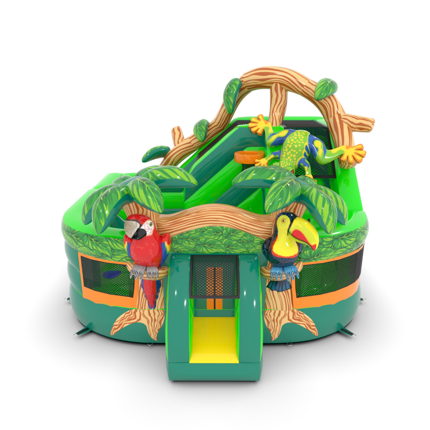 Odkryj tajemnice dzikiej przygody z dmuchanym zamkiem w motywie dżungli! Ta niesamowita atrakcja przenosi dzieci w serce tropikalnego rajskiego krajobrazu, gdzie mogą eksplorować, skakać i cieszyć się niekończącą się zabawą. To idealny sposób, aby wciągnąć dzieci w świat wyobraźni i aktywności fizycznej, otwierając drzwi do nieograniczonych przygód.