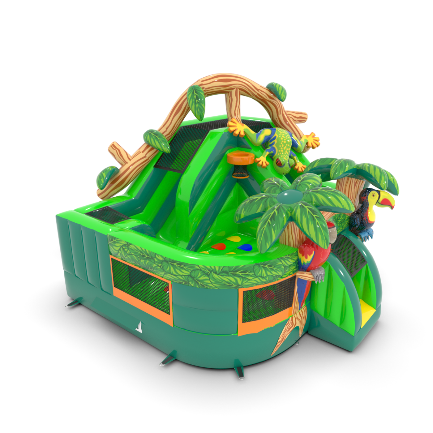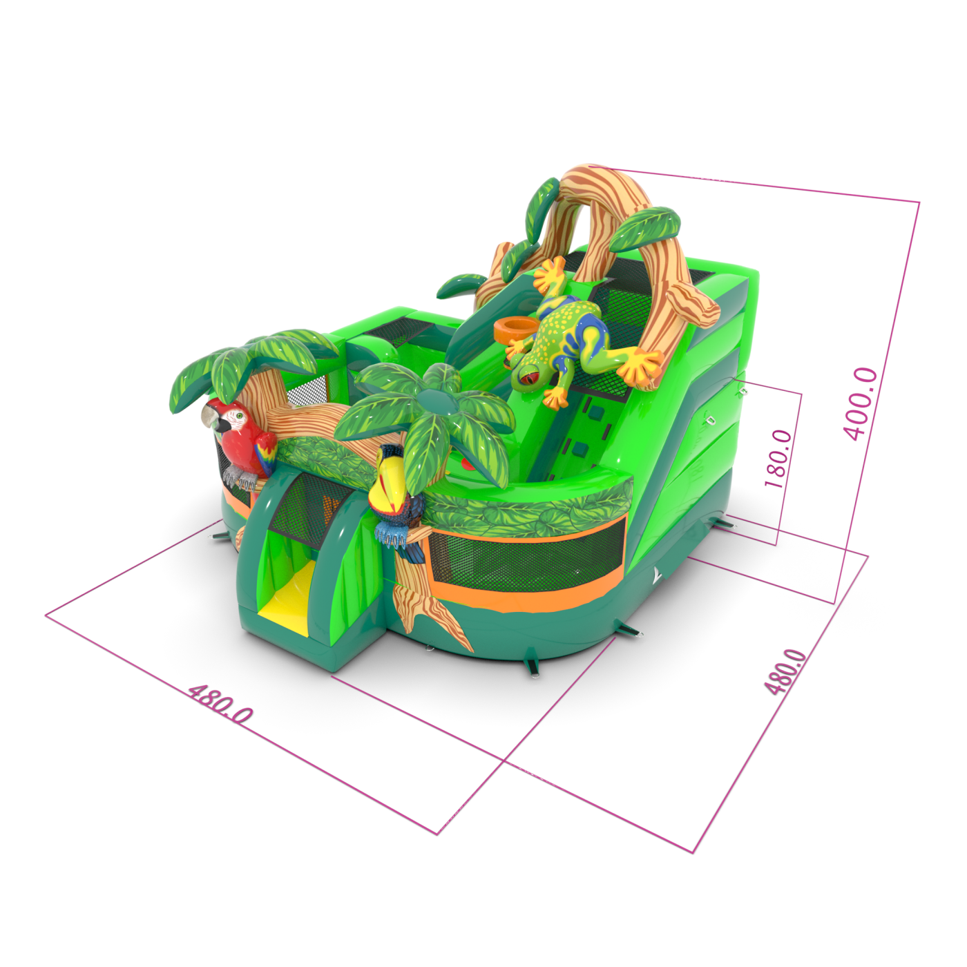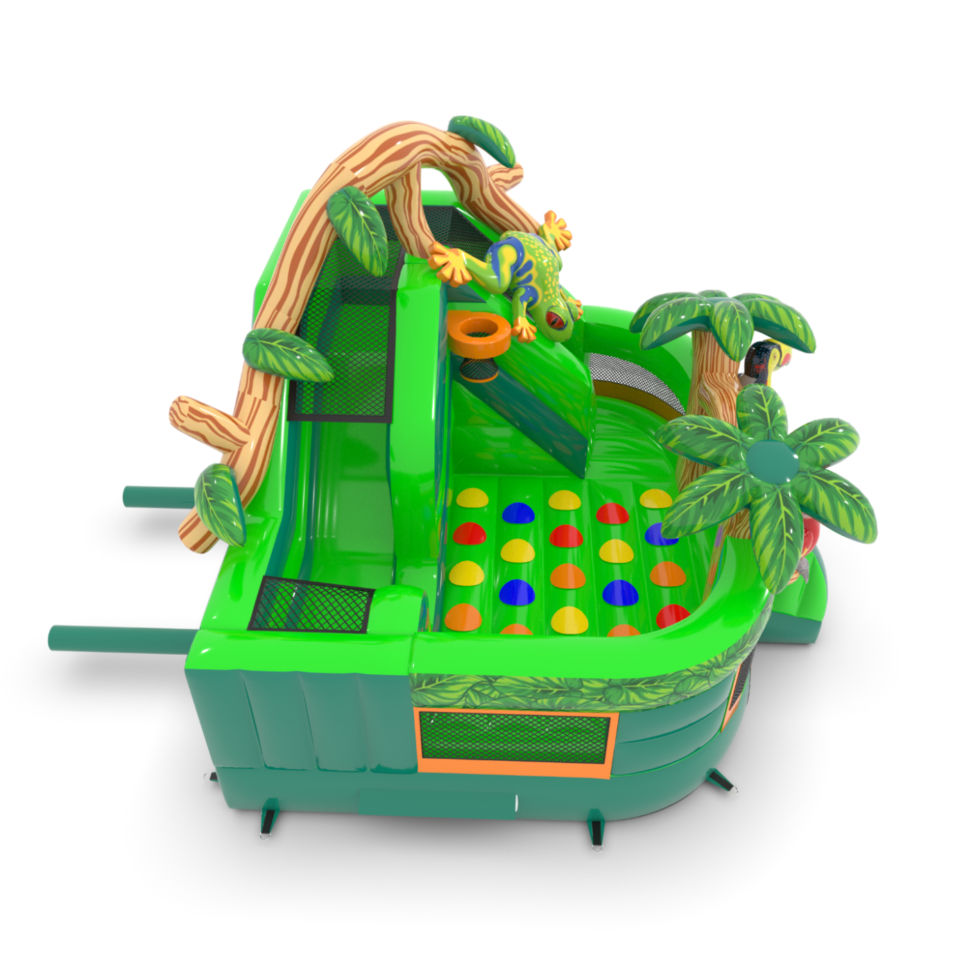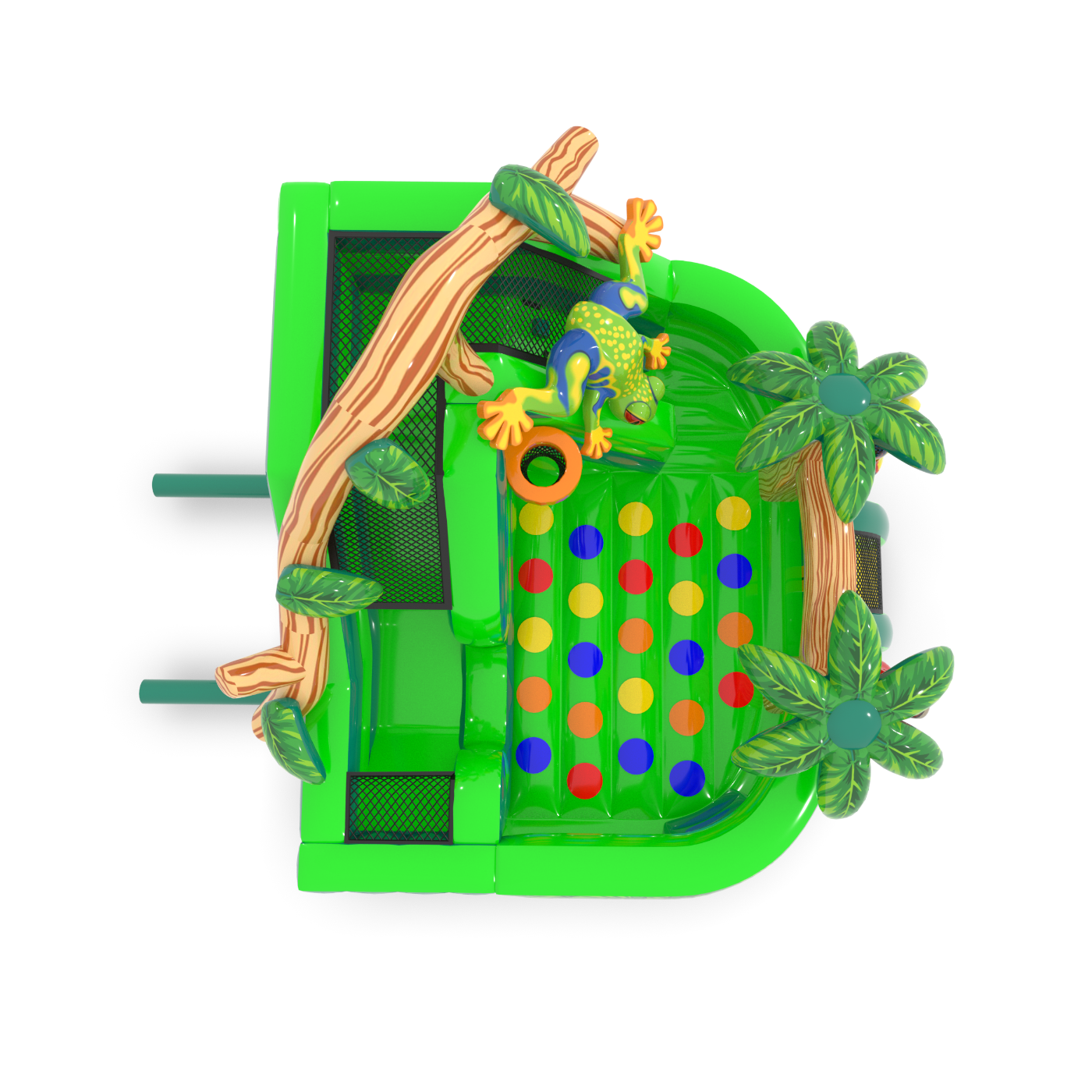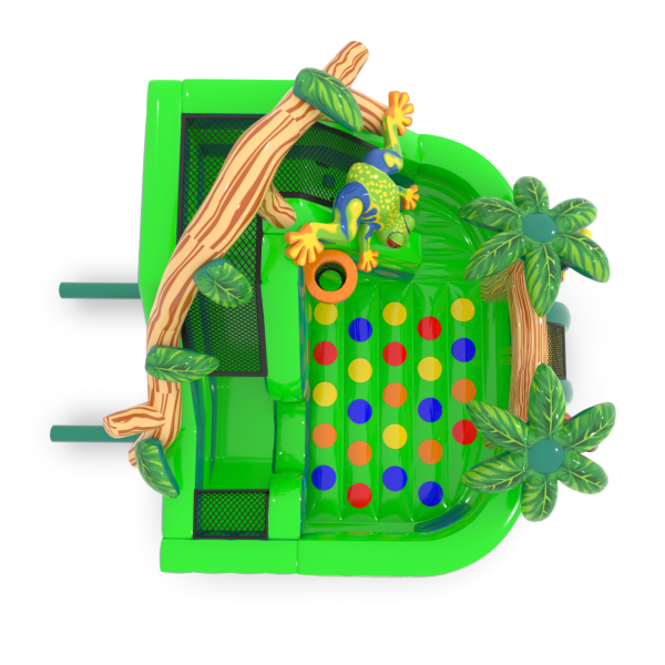 Dmuchany plac zabaw "żabka" w motywie dżungli dedykowany jest głównie dla dzieci, które poszukują przygody w czasie zabaw z przyjaciółmi i rówieśnikami. Dmuchany plac zabaw jest ogrodzony i miękki, a dzięki temu całkowicie bezpieczny podczas użytkowania. Zwykle składa się z dużej oraz małej zjeżdżalni, dlatego dzieci w różnym wieku będą się na nim świetnie bawić.Dmuchany plac zabaw "żabka" w motywie dżungli bardzo dobrze sprawdzi się na piknikach rodzinnych, imprezach integracyjnych i pracowniczych czy eventach innego rodzaju – w plenerze i nie tylko. Dmuchane place zabaw są doskonałą alternatywą dla większych i bardziej wymagających dmuchańców. Szczególnie polecamy tę atrakcję w przypadku rozpoczęcia biznesu.