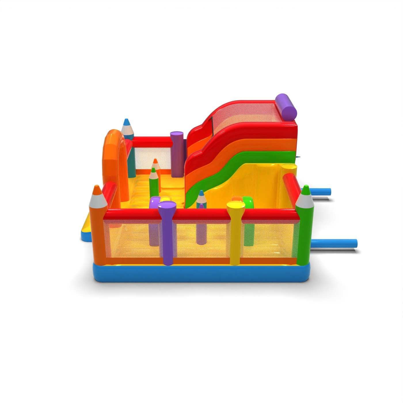 Dmuchany plac zabaw 6x6 w motywie kredek dedykowany jest głównie dla dzieci, które poszukują przygody w czasie zabaw z przyjaciółmi i rówieśnikami. Dmuchany plac zabaw jest ogrodzony i miękki, a dzięki temu całkowicie bezpieczny podczas użytkowania. Zwykle składa się z dużej oraz małej zjeżdżalni, dlatego dzieci w różnym wieku będą się na nim świetnie bawić.Dmuchany plac zabaw 6x6 w motywie kredek bardzo dobrze sprawdzi się na piknikach rodzinnych, imprezach integracyjnych i pracowniczych czy eventach innego rodzaju – w plenerze i nie tylko. Dmuchane place zabaw są doskonałą alternatywą dla większych i bardziej wymagających dmuchańców. Szczególnie polecamy tę atrakcję w przypadku rozpoczęcia biznesu.