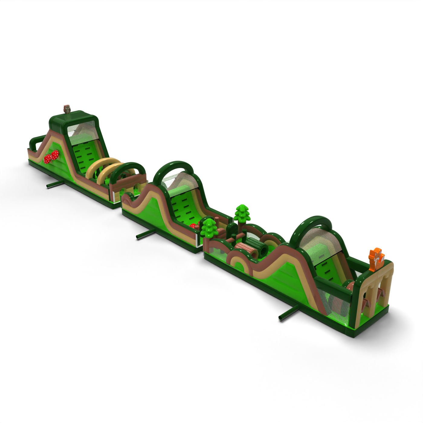 Dmuchany tor przeszkód Leśny - 30m dedykowany jest niemal dla każdego, kto lubi dobrą zabawę połączoną z rywalizacją. Dmuchany tor przeszkód został zaprojektowany z myślą głównie o młodzieży i dorosłych, ale również jest przeznaczony dla dzieci od 6-go roku życia. Niemal każdy odnajdzie w tej atrakcji elementy, które sprawią wiele radości w czasie zabawy. Produkt ten dedykujemy wszystkim tym, którzy chcą odnaleźć w sobie ducha rywalizacji w czasie wielogodzinnych zabaw w plenerze. Atrakcje z tej serii mogą zawierać w sobie wiele elementów o zróżnicowanym stopniu trudności do pokonania. Wspinaczka po ścianie, szybki ślizg, by wreszcie przeczołgać się między wystającymi elementami, które utrudniają jak najszybsze pokonanie trasy.