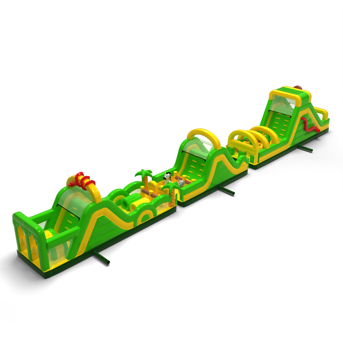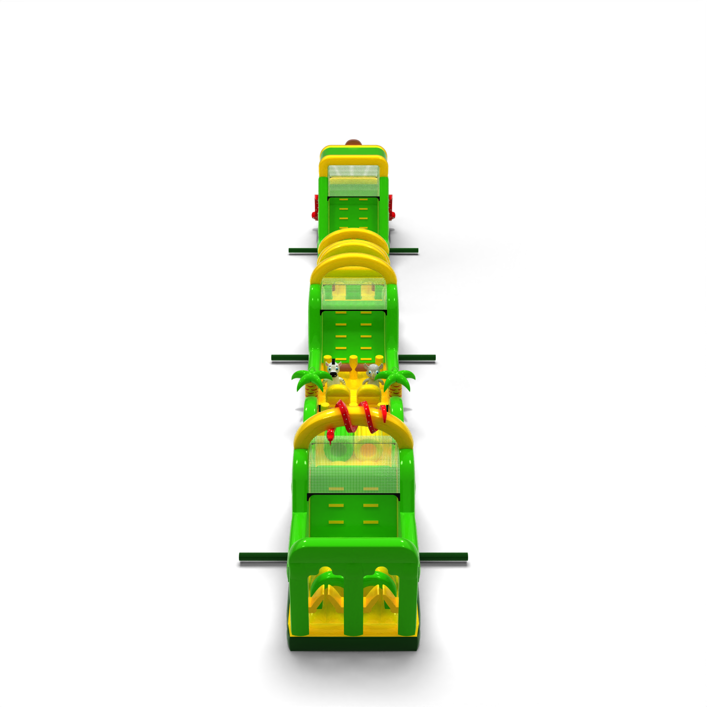 Dmuchany tor przeszkód Dżungla - 30m dedykowany jest niemal dla każdego, kto lubi dobrą zabawę połączoną z rywalizacją. Dmuchany tor przeszkód został zaprojektowany z myślą głównie o młodzieży i dorosłych, ale również jest przeznaczony dla dzieci od 6-go roku życia. Niemal każdy odnajdzie w tej atrakcji elementy, które sprawią wiele radości w czasie zabawy. Produkt ten dedykujemy wszystkim tym, którzy chcą odnaleźć w sobie ducha rywalizacji w czasie wielogodzinnych zabaw w plenerze. Atrakcje z tej serii mogą zawierać w sobie wiele elementów o zróżnicowanym stopniu trudności do pokonania. Wspinaczka po ścianie, szybki ślizg, by wreszcie przeczołgać się między wystającymi elementami, które utrudniają jak najszybsze pokonanie trasy.