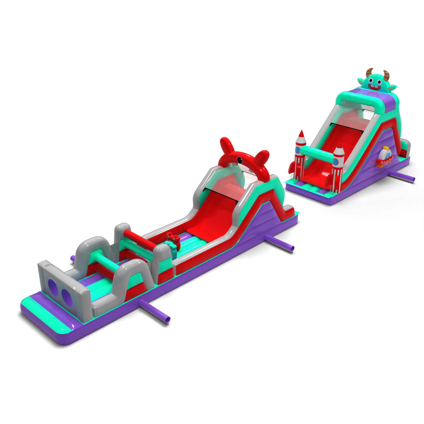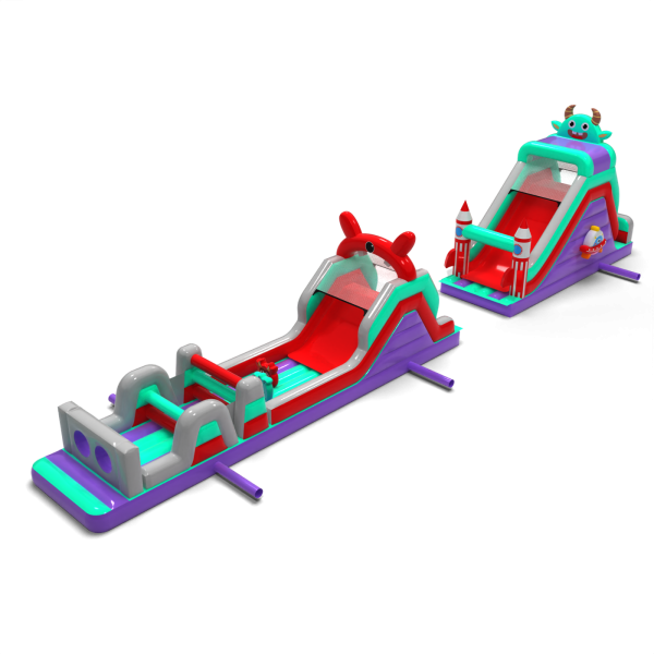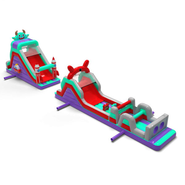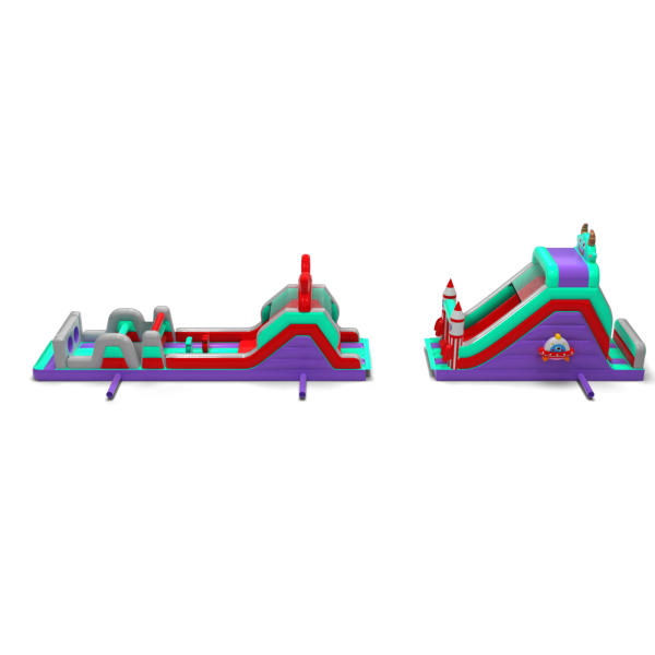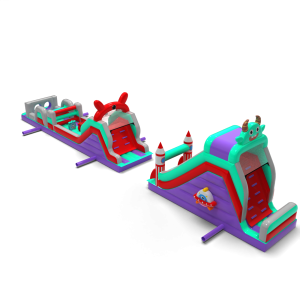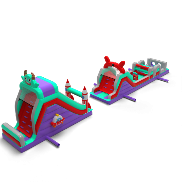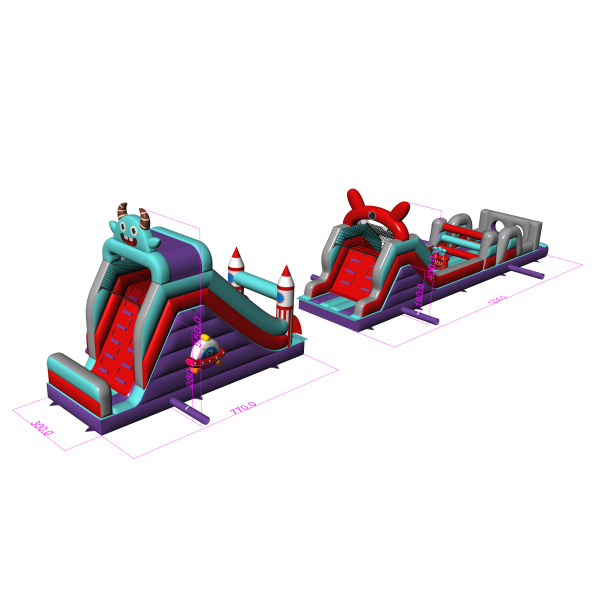 20-metrowy tor przeszkód w stylu kosmicznym to dobrze zbalansowana atrakcja do wykorzystania na różnego rodzaju wydarzeniach. Składa się z trzech głównych segmentów, w tym części z podwójnym zjazdem i sekcji do przechodzenia przez przeszkody. Dzięki większej długości zapewnia dłuższą trasę pokonywania, co sprawia, że dzieci mogą bawić się dłużej bez konieczności częstej rotacji. Motyw graficzny utrzymany jest w spójnej i przyjaznej estetyce.