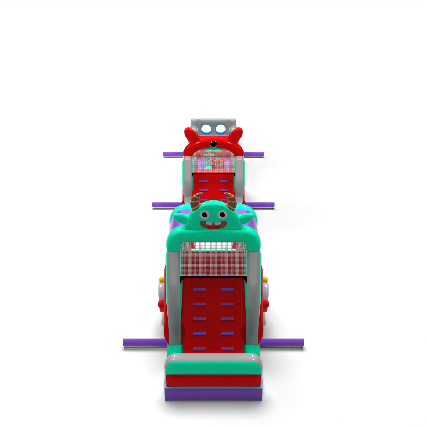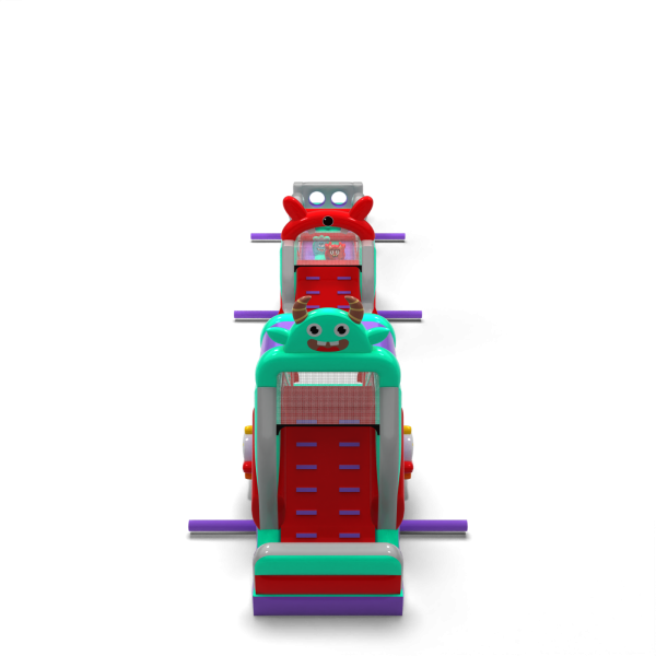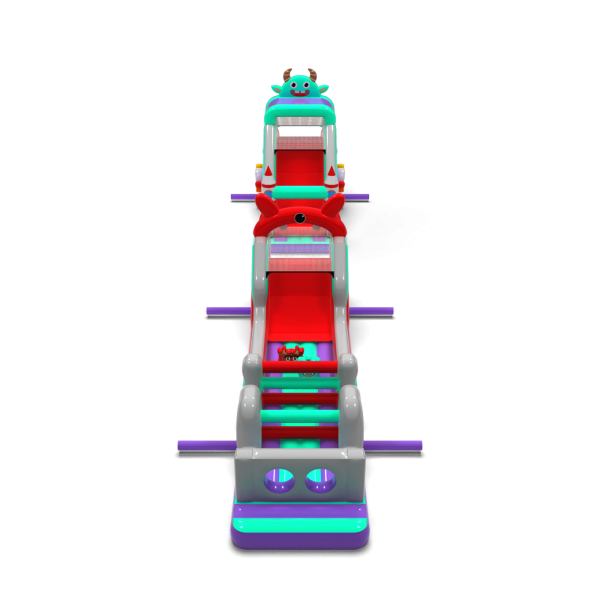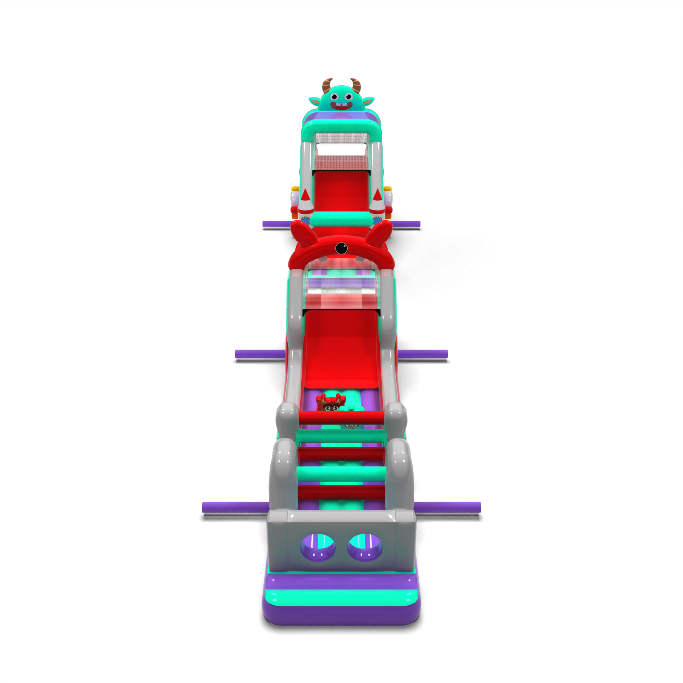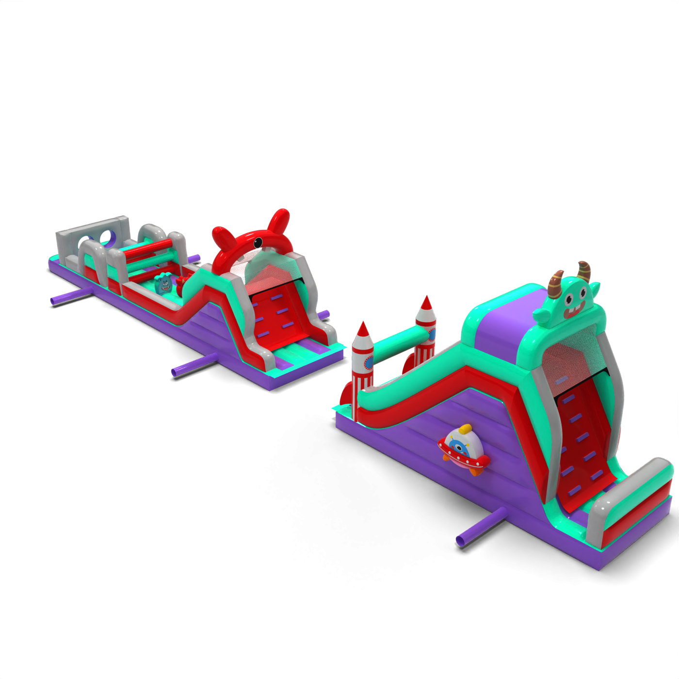 20-metrowy tor przeszkód w stylu kosmicznym to dobrze zbalansowana atrakcja do wykorzystania na różnego rodzaju wydarzeniach. Składa się z trzech głównych segmentów, w tym części z podwójnym zjazdem i sekcji do przechodzenia przez przeszkody. Dzięki większej długości zapewnia dłuższą trasę pokonywania, co sprawia, że dzieci mogą bawić się dłużej bez konieczności częstej rotacji. Motyw graficzny utrzymany jest w spójnej i przyjaznej estetyce.