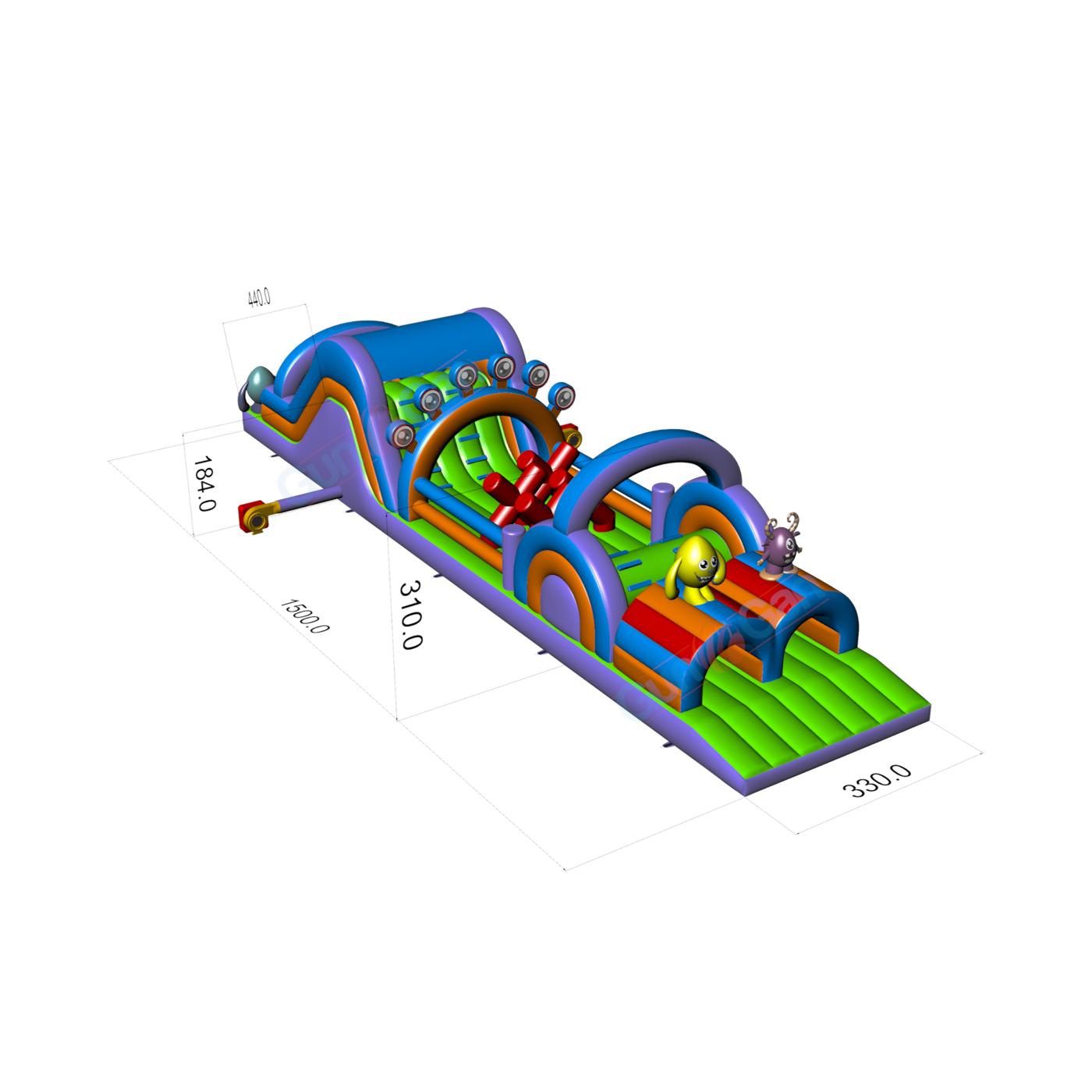 Dmuchany tor przeszkód Potworki - 15m dedykowany jest niemal dla każdego, kto lubi dobrą zabawę połączoną z rywalizacją. Dmuchany tor przeszkód został zaprojektowany z myślą głównie o młodzieży i dorosłych, ale również jest przeznaczony dla dzieci od 6-go roku życia. Niemal każdy odnajdzie w tej atrakcji elementy, które sprawią wiele radości w czasie zabawy. Produkt ten dedykujemy wszystkim tym, którzy chcą odnaleźć w sobie ducha rywalizacji w czasie wielogodzinnych zabaw w plenerze. Atrakcje z tej serii mogą zawierać w sobie wiele elementów o zróżnicowanym stopniu trudności do pokonania. Wspinaczka po ścianie, szybki ślizg, by wreszcie przeczołgać się między wystającymi elementami, które utrudniają jak najszybsze pokonanie trasy.