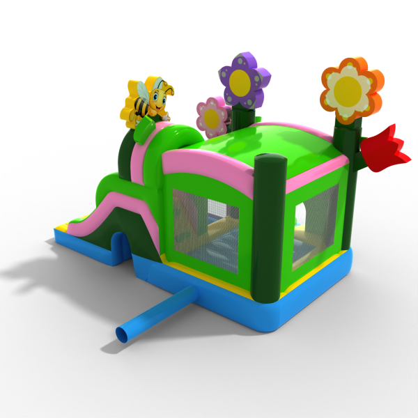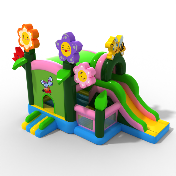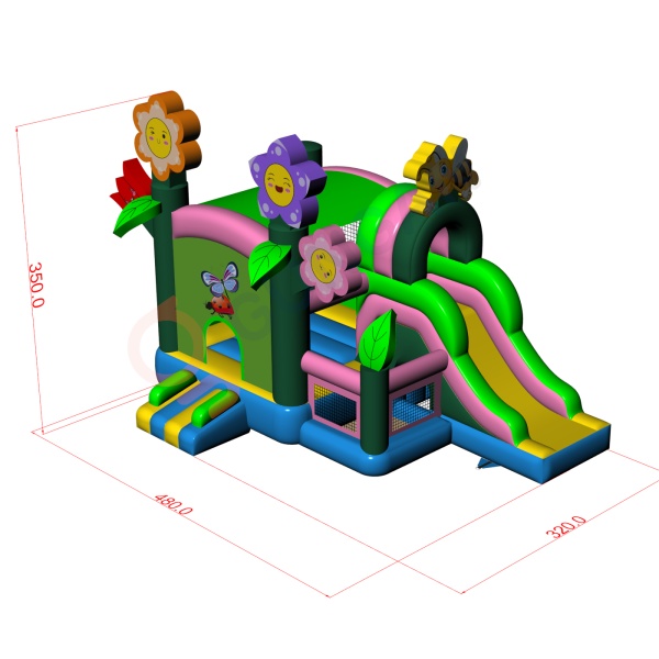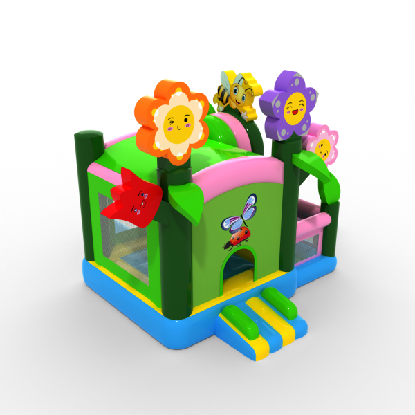 Nasz dmuchaniec w motywie kolorowych kwiatów gdzie dominują żywe kolory i wzory, przenosi dzieci w świat natury, a motywy pszczół i robaczków dodają uroku tej atrakcji. Zaprojektowany w Polsce, cechuje się bezpieczeństwem i trwałością, co gwarantuje bezpieczną zabawę dla dzieci. Idealny na festyny i imprezy plenerowe, ten dmuchaniec zachęca do aktywności i odkrywania piękna przyrody.