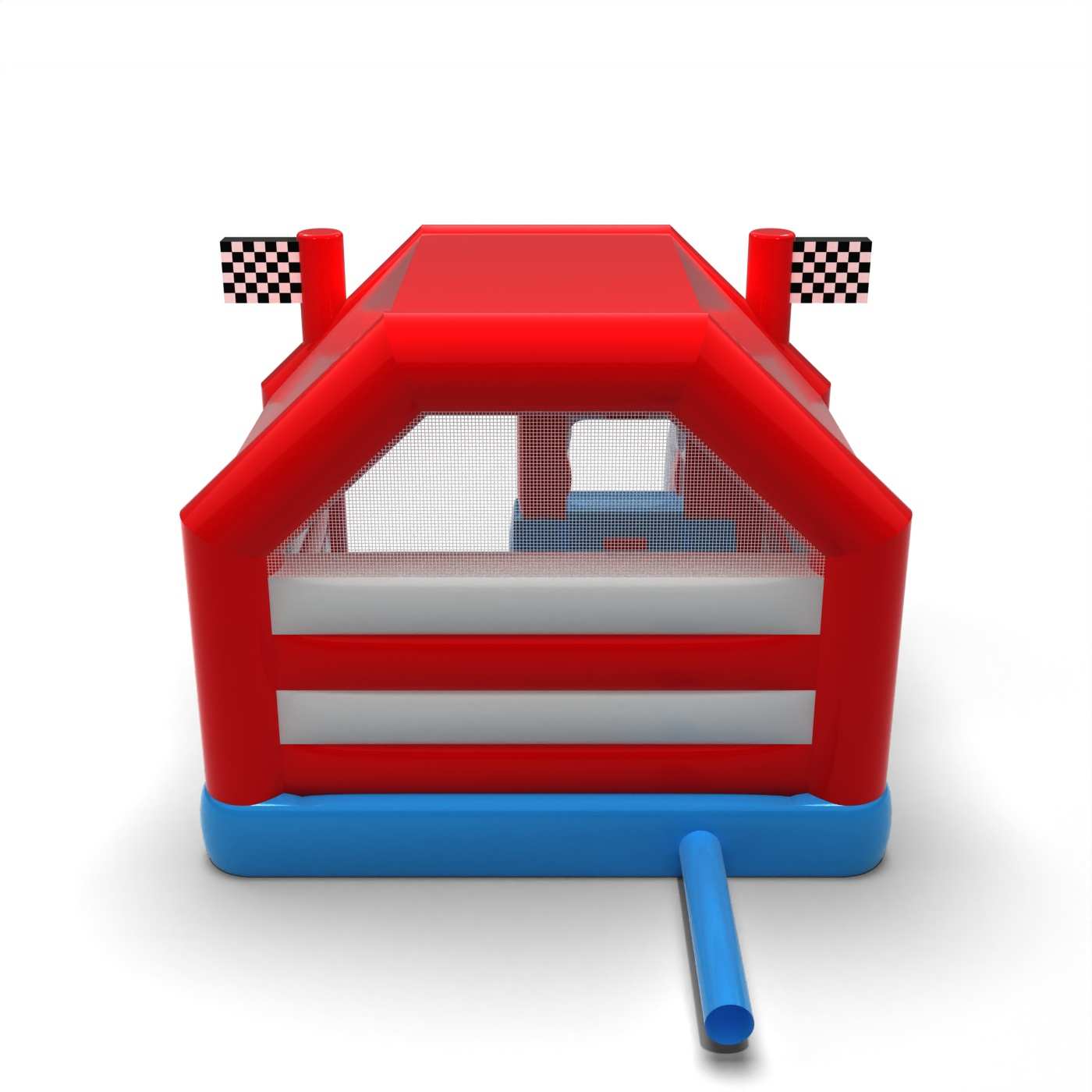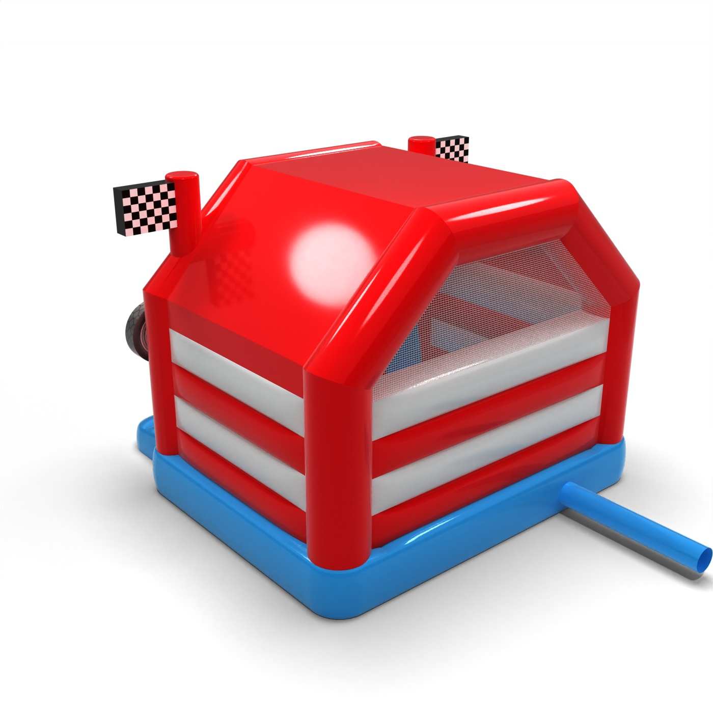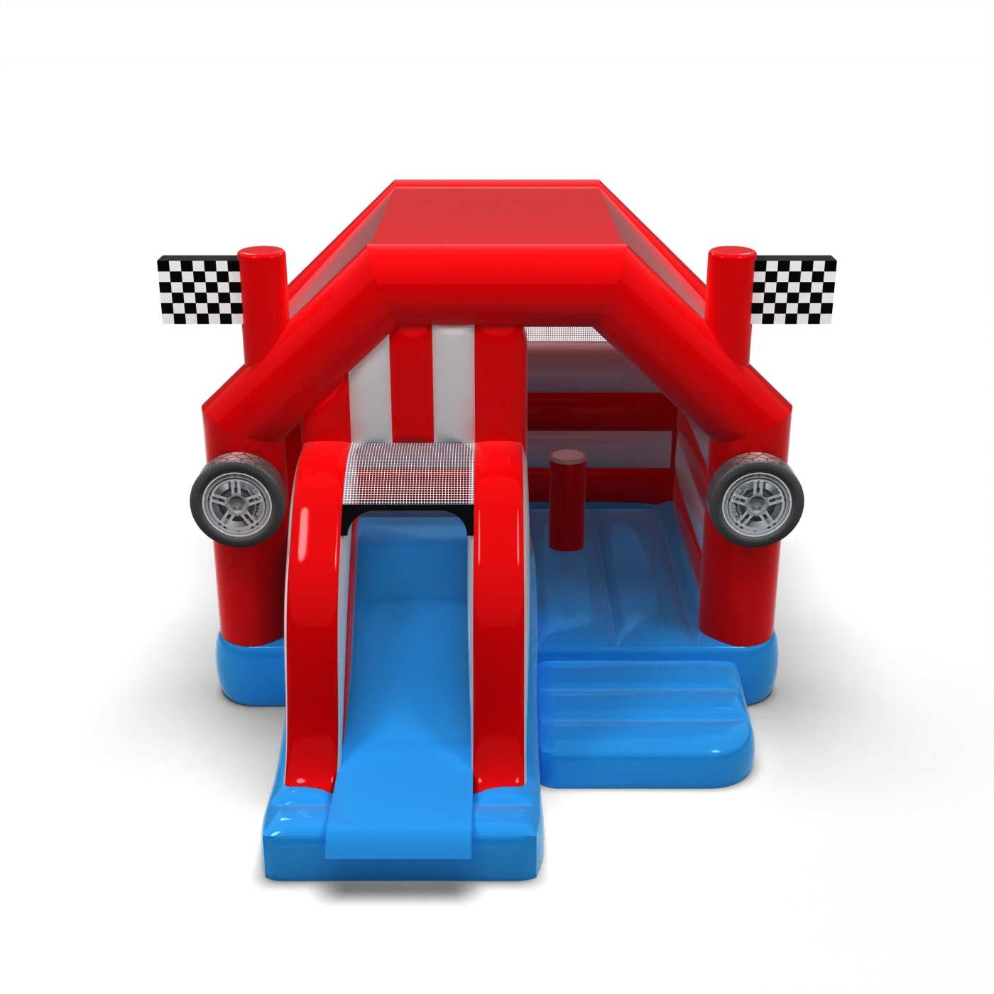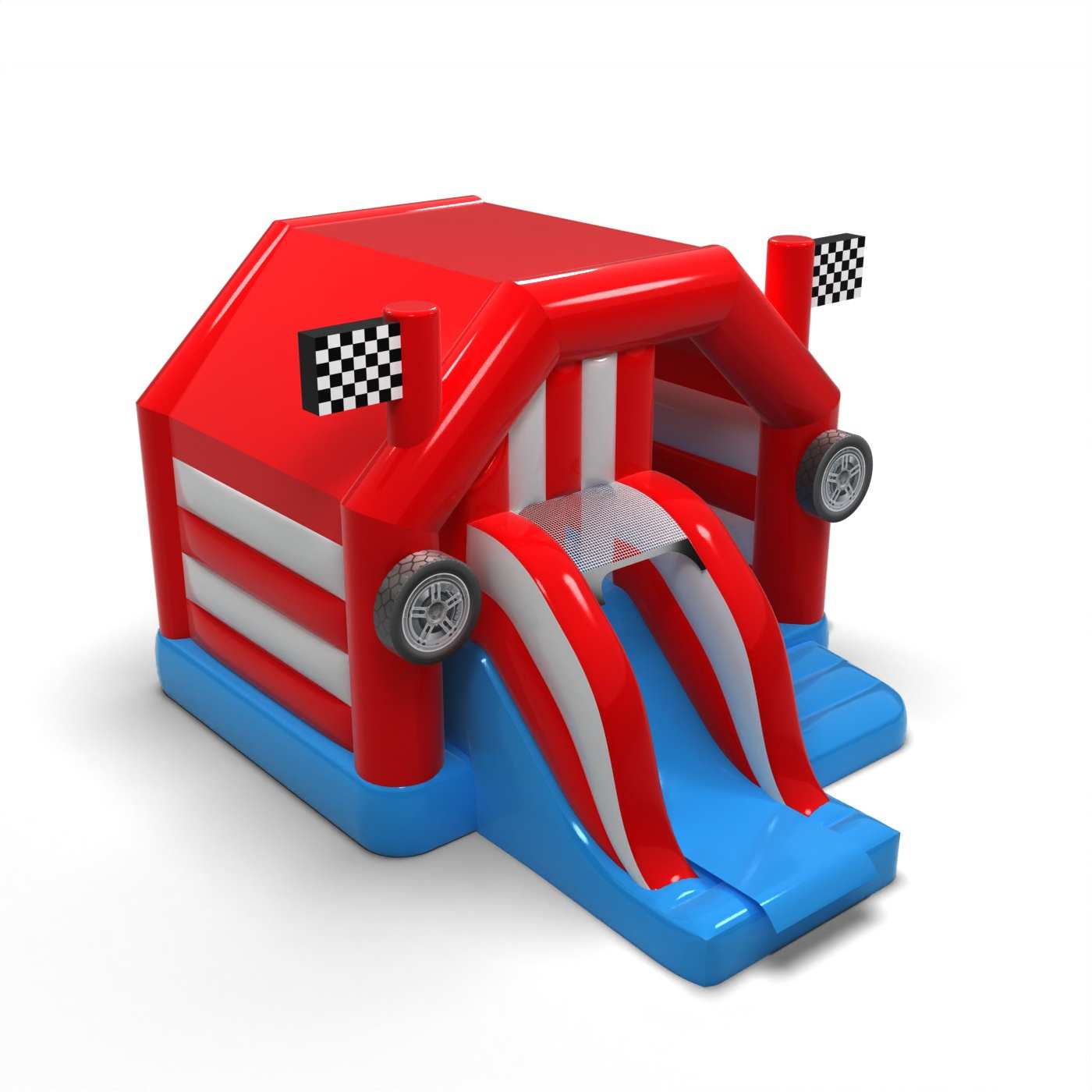 Forma inspirowana pit stopem wyścigowym tworzy wyrazistą i dynamiczną strefę zabawy pełną ruchu i energii. Połączenie przestrzeni do skakania ze zjazdem zachęca dzieci do aktywności i rywalizacji w bezpiecznej, zabawowej formie. Motoryzacyjna stylistyka przyciąga uwagę i natychmiast buduje skojarzenia ze światem wyścigów. To propozycja dla organizatorów, którzy chcą wprowadzić do strefy dziecięcej wyraźny, sportowy akcent. Atrakcja świetnie sprawdzi się na festynach, piknikach rodzinnych i tematycznych eventach plenerowych.