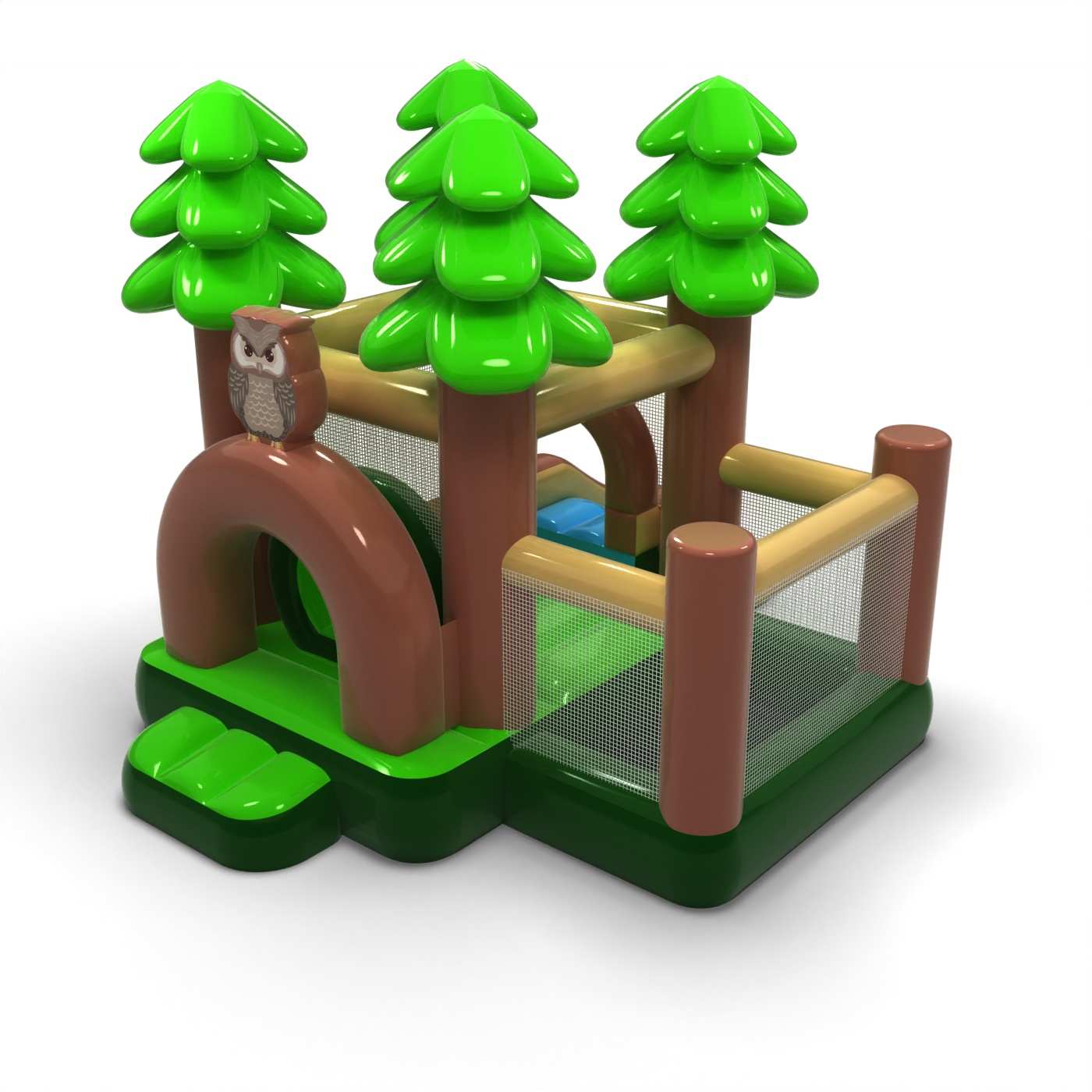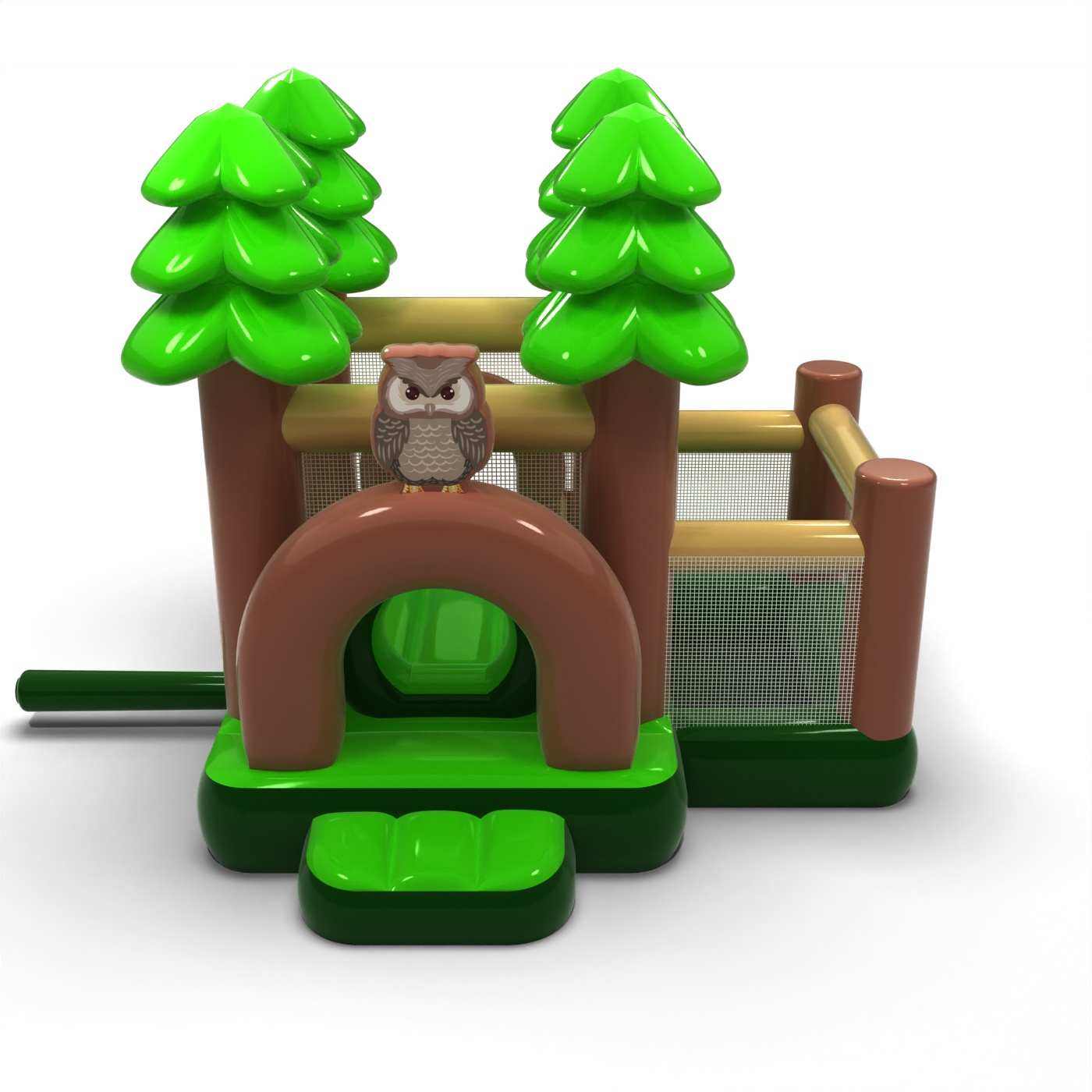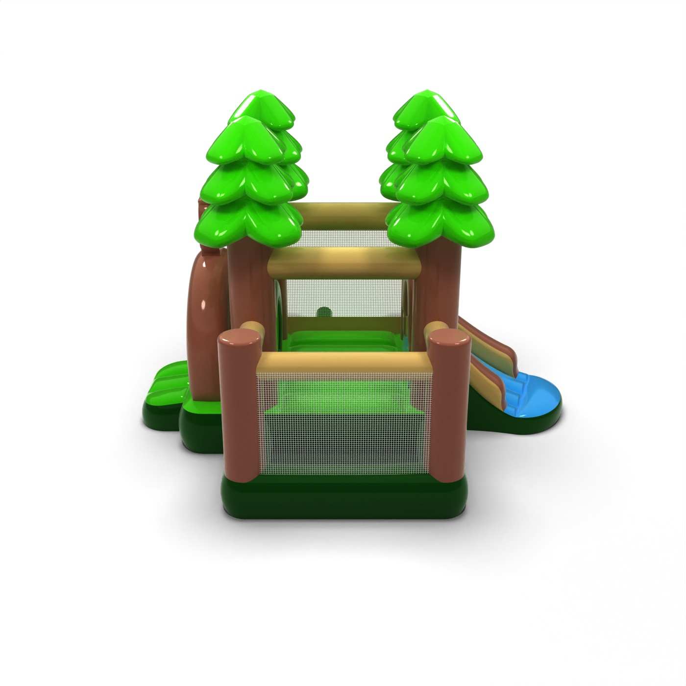Leśna stylistyka inspirowana naturą tworzy spokojną i przyjazną przestrzeń zabawy dla najmłodszych dzieci. Połączenie strefy skakania z suchym basenem pozwala maluchom bezpiecznie się poruszać i swobodnie odkrywać atrakcję. Stonowana oprawa wizualna w naturalnych barwach sprzyja wyciszonej, rodzinnej atmosferze wydarzenia. Kompaktowy rozmiar ułatwia organizację strefy dziecięcej nawet w ograniczonej przestrzeni. Atrakcja doskonale sprawdzi się na piknikach rodzinnych, festynach i plenerowych animacjach dla najmłodszych.