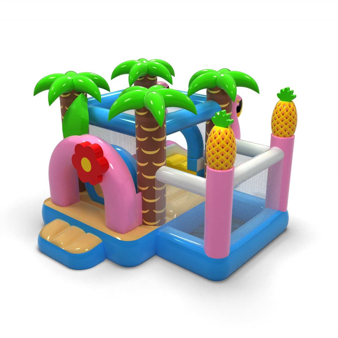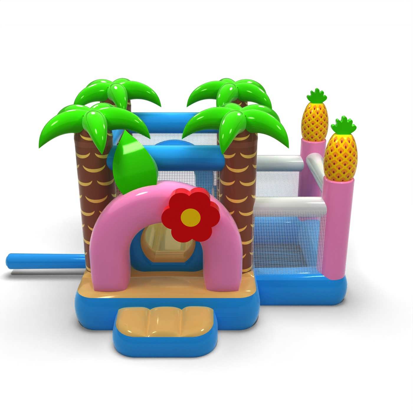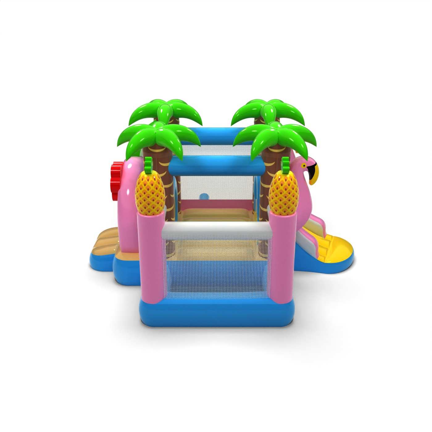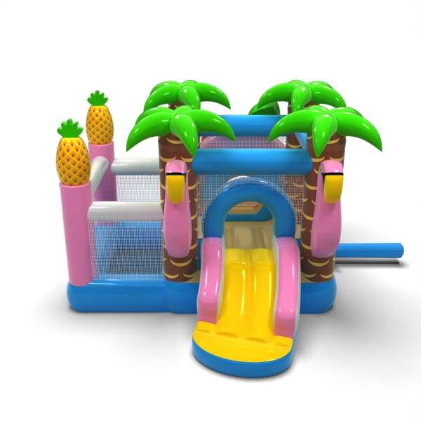 Tropikalna stylistyka inspirowana wakacyjnym klimatem tworzy radosną i przyjazną przestrzeń zabawy dla najmłodszych dzieci. Połączenie strefy skakania z suchym basenem pozwala maluchom swobodnie się poruszać i bezpiecznie korzystać z atrakcji. Letnia oprawa wizualna buduje pozytywne emocje i dobrze wpisuje się w plenerowy charakter wydarzeń. Kompaktowy format sprawia, że dmuchaniec łatwo zorganizować nawet w mniejszej strefie animacji. Atrakcja świetnie sprawdzi się na piknikach rodzinnych, festynach i letnich wydarzeniach na świeżym powietrzu.