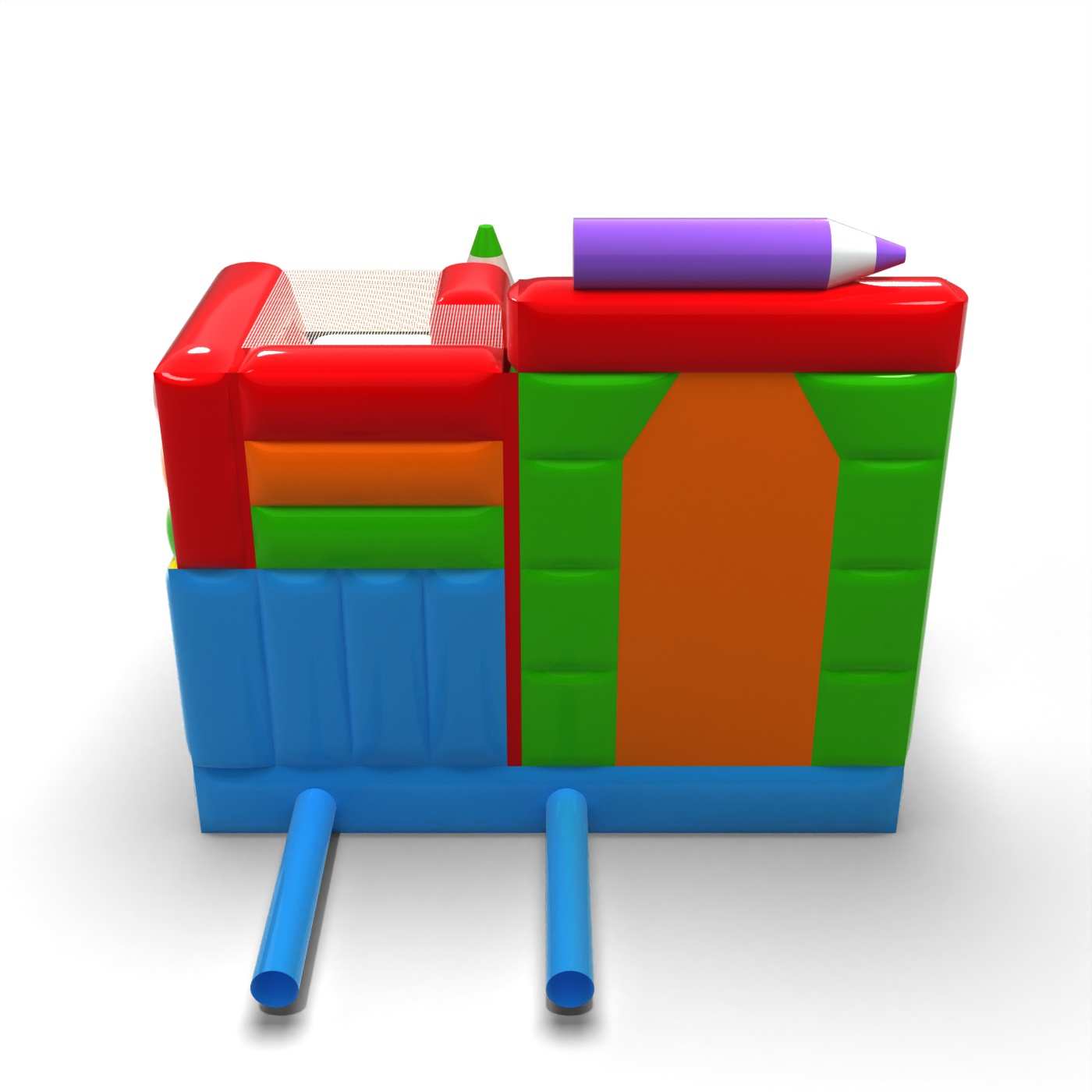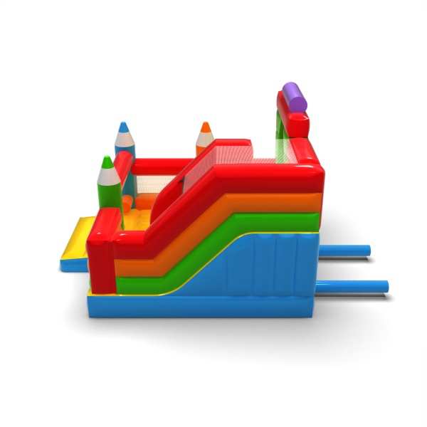Kredkowa forma konstrukcji nadaje tej atrakcji kreatywny i przyjazny charakter, który od razu kojarzy się z zabawą i twórczością. Połączenie strefy skakania ze zjeżdżalnią pozwala dzieciom aktywnie korzystać z atrakcji i utrzymuje ich zainteresowanie na dłużej. Pastelowa estetyka i charakterystyczne elementy w kształcie kredek budują lekki, edukacyjny klimat wydarzenia. To uniwersalna propozycja dla wypożyczalni obsługujących rodzinne festyny i strefy animacji. Atrakcja sprawdzi się na piknikach, wydarzeniach szkolnych i plenerowych imprezach dla dzieci.