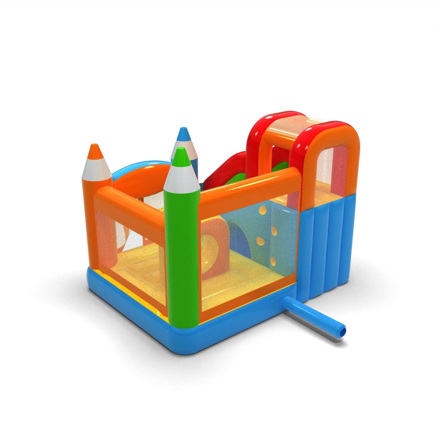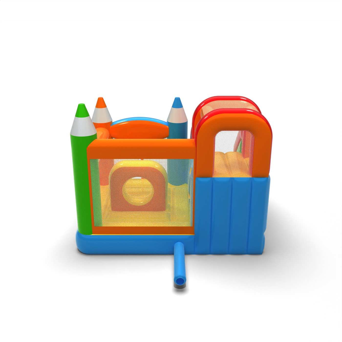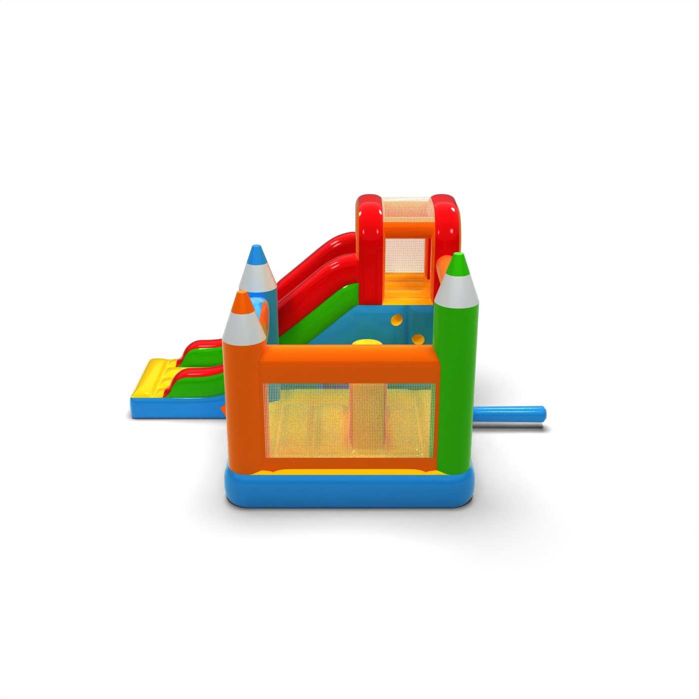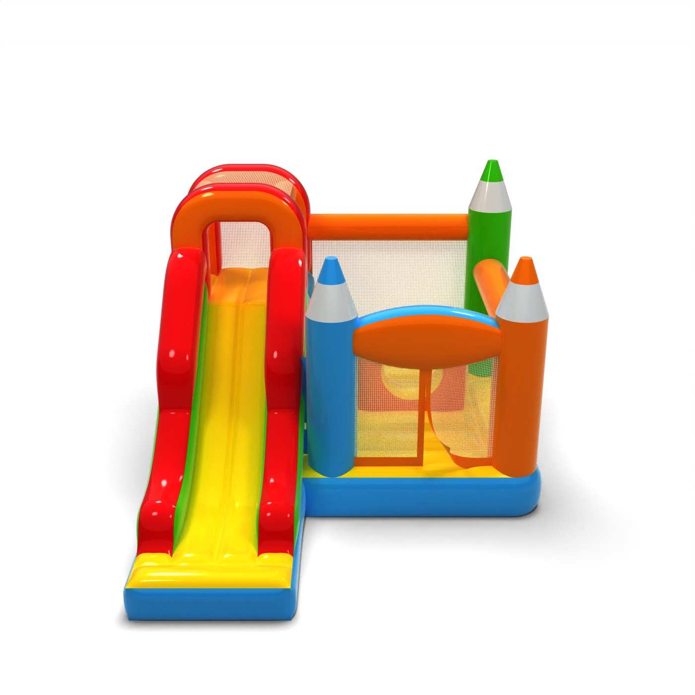 Kredkowe elementy konstrukcji nadają tej atrakcji lekki, kreatywny wygląd, który wyróżnia się na tle klasycznych dmuchańców. Połączenie skakania i zjazdu zapewnia dzieciom urozmaiconą zabawę i naturalną rotację uczestników. Pastelowa kolorystyka buduje spokojny, edukacyjny klimat sprzyjający rodzinnej zabawie. To praktyczny wybór dla wypożyczalni szukających atrakcji o uniwersalnym zastosowaniu i przyjaznej estetyce. Dmuchaniec dobrze sprawdzi się na festynach, piknikach i plenerowych strefach animacji.
