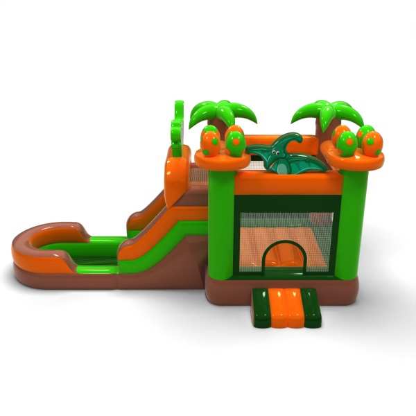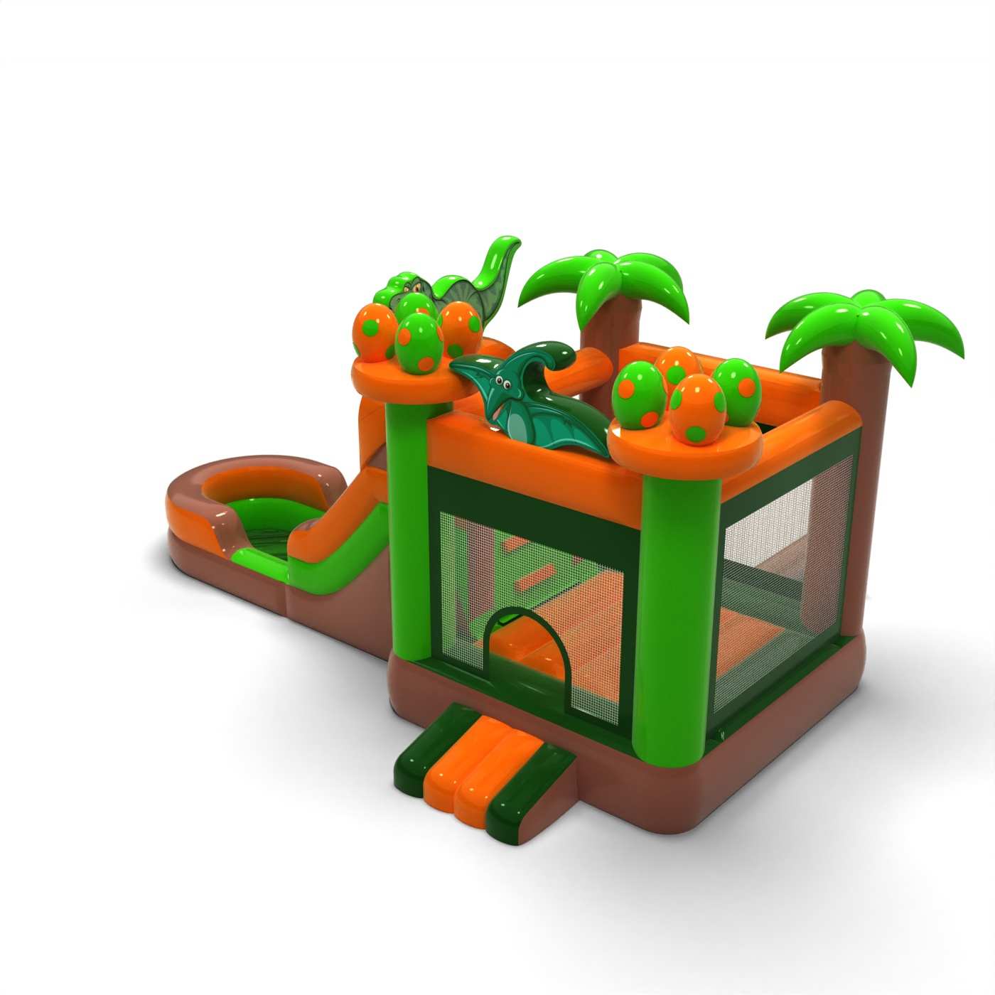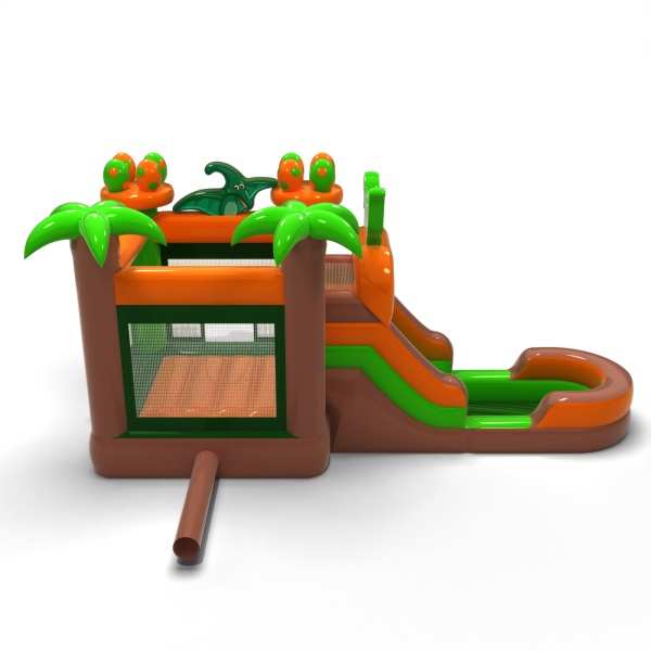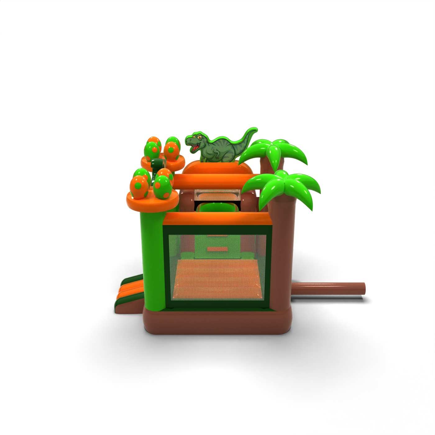 Rozbudowana forma i jurajski klimat tworzą spójną, tematyczną strefę zabawy inspirowaną światem dinozaurów. Połączenie skakania i zjazdu pozwala dzieciom aktywnie eksplorować atrakcję i utrzymuje ich zaangażowanie przez dłuższy czas. Rozbudowana oprawa wizualna podkreśla klimat przygody i świetnie wspiera animacje tematyczne. To propozycja dla organizatorów, którzy chcą wyróżnić swoją strefę dziecięcą bardziej rozbudowaną atrakcją. Model sprawdzi się na festynach, dniach miasta i większych eventach rodzinnych.