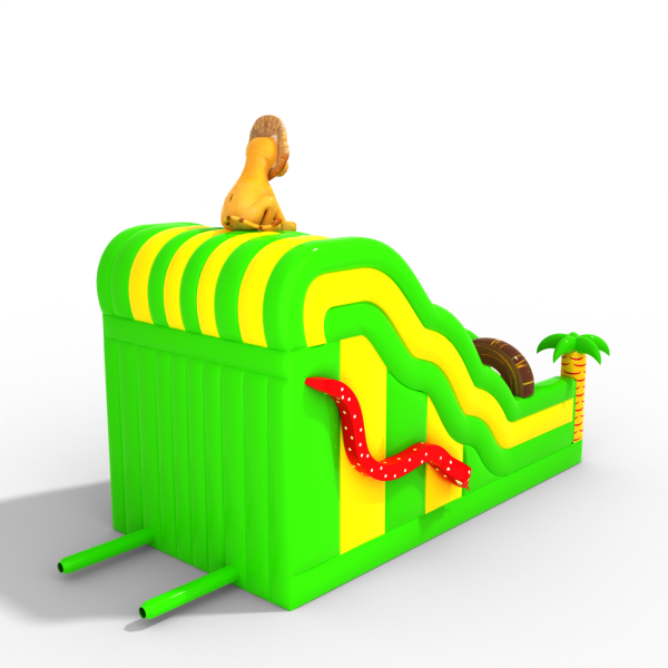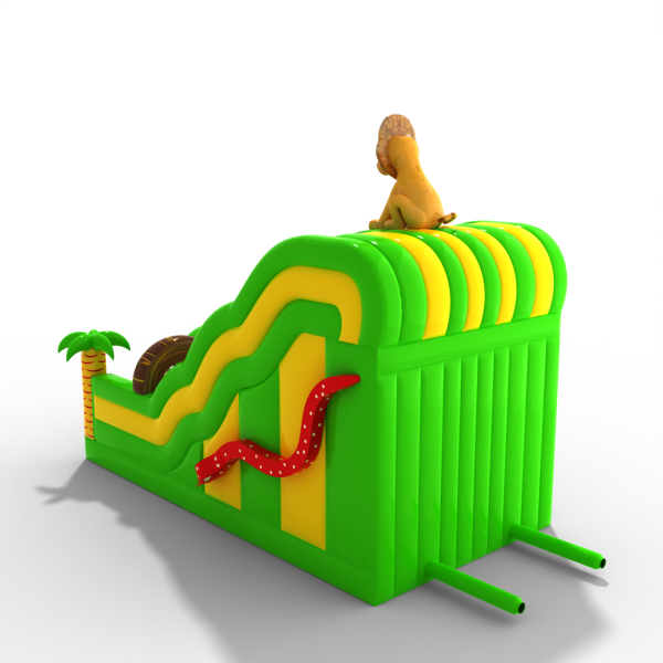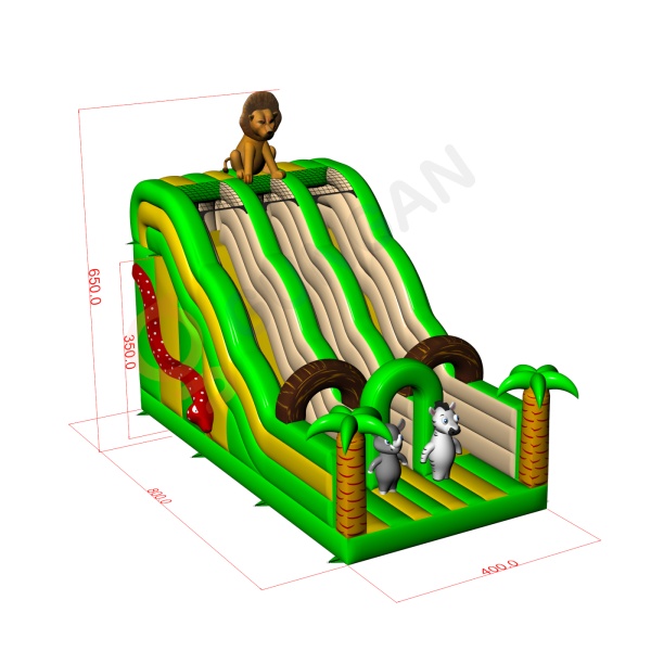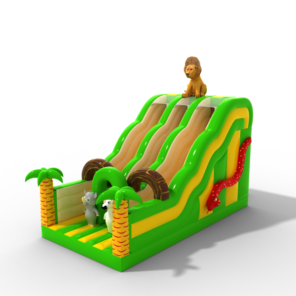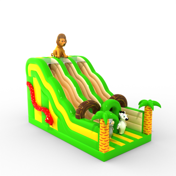 Podwójna otwarta zjeżdżalnia z motywem dżungli to fantastyczny dmuchaniec dla dzieci i młodzieży. Świetnie sprawdzi się w zestawie z naszymi pozostałymi atrakcjami w różnych motywach. Podwójna otwarta zjeżdżalnia z motywem dżungli wzbudza zainteresowanie dzieci, gdy tylko znajdzie się w zasięgu ich wzroku. Najmłodsi uczestnicy eventów przepadają za dobrą zabawą, dlatego ta zjeżdżalnia może być jednym z bardziej popularnych dmuchańców w Twojej ofercie. Dmuchańce z tej kategorii są efektowne, posiadają zwykle wiele zdobień i elementów, które zachęcają do podjęcia skocznej zabawy na świeżym powietrzu.
