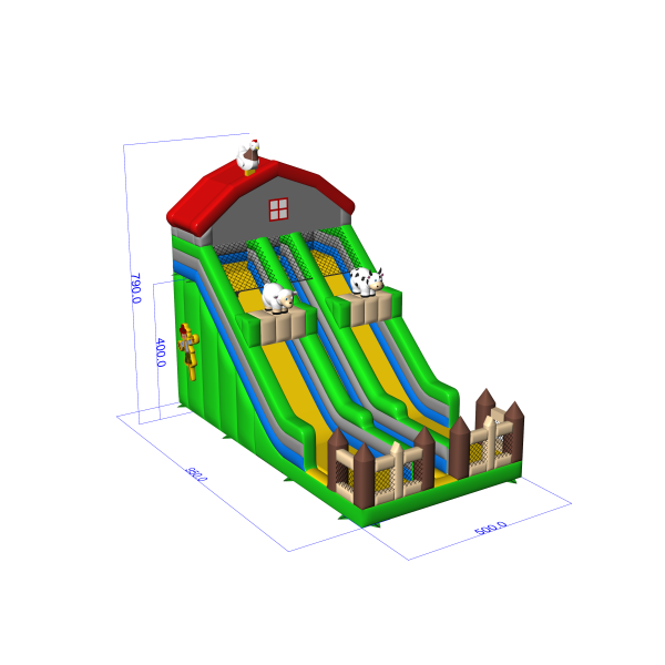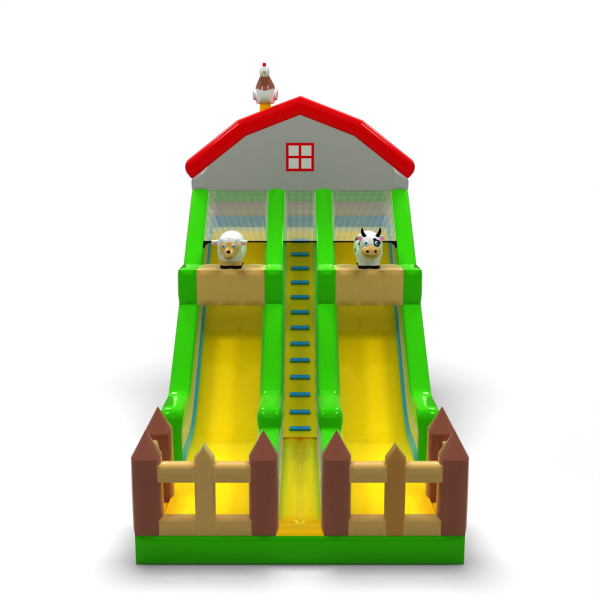 Imponująca zjeżdżalnia o wiejskim klimacie z figurami zwierząt i dachem stylizowanym na stodołę to atrakcja, która przyciąga zarówno dzieci, jak i dorosłych. Dzięki dużej wysokości i dwóm szerokim torom zjazdowym zapewnia dynamiczną zabawę oraz obsługę dużych grup uczestników. Świetnie sprawdzi się na wydarzeniach tematycznych, imprezach gminnych i festynach, gdzie liczy się widoczność, wydajność i efektowność atrakcji.
