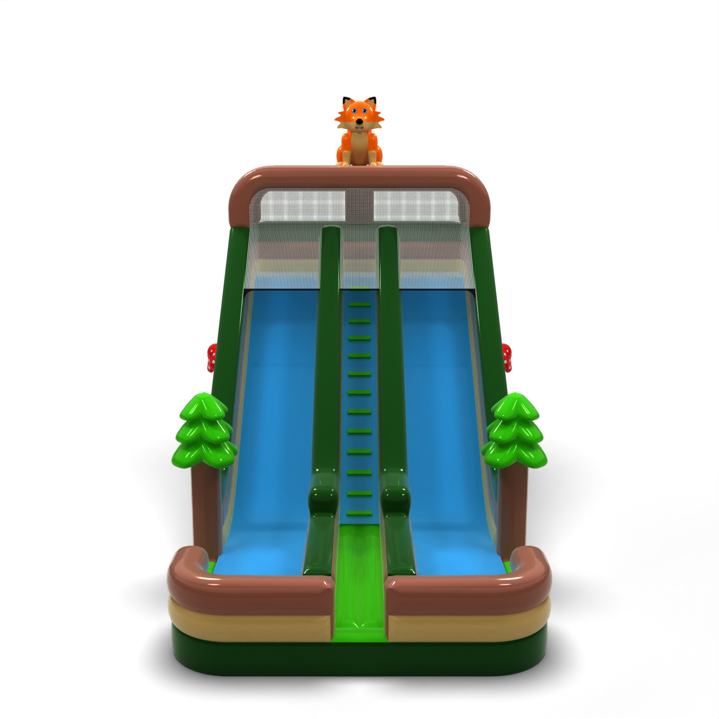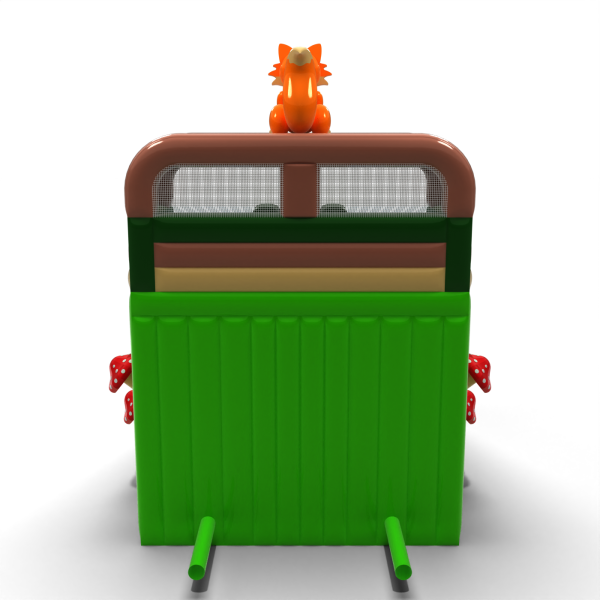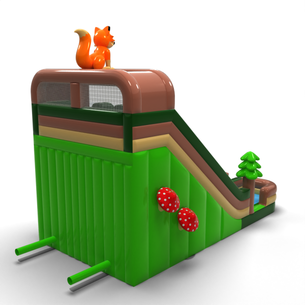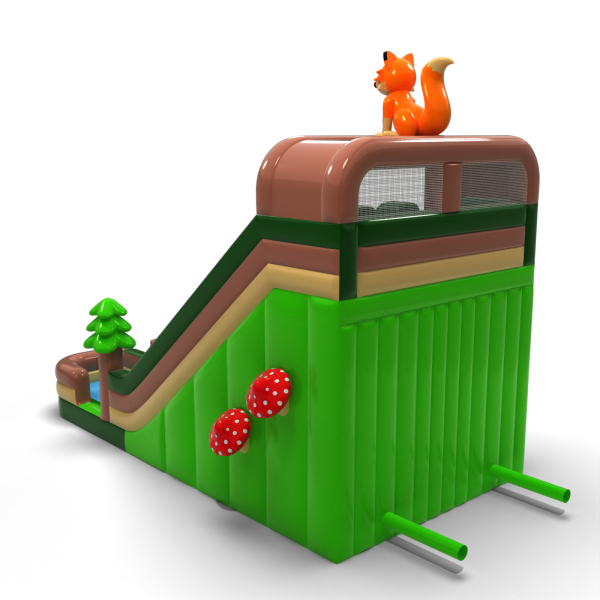 Leśna zjeżdżalnia z motywem natury to propozycja, która idealnie wpisuje się w scenariusze plenerowe, pikniki edukacyjne i imprezy rodzinne. Dekoracje w formie drzew, grzybów i uroczego lisa przyciągają uwagę dzieci i dodają całości przyjaznego charakteru. Dwa równoległe tory zjazdowe gwarantują płynną obsługę większych grup uczestników. To konstrukcja, która wyróżnia się estetyką, wysokością i efektywnością na każdym evencie.