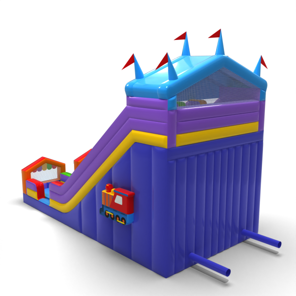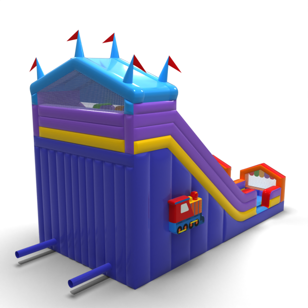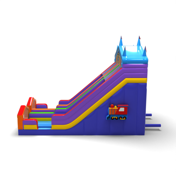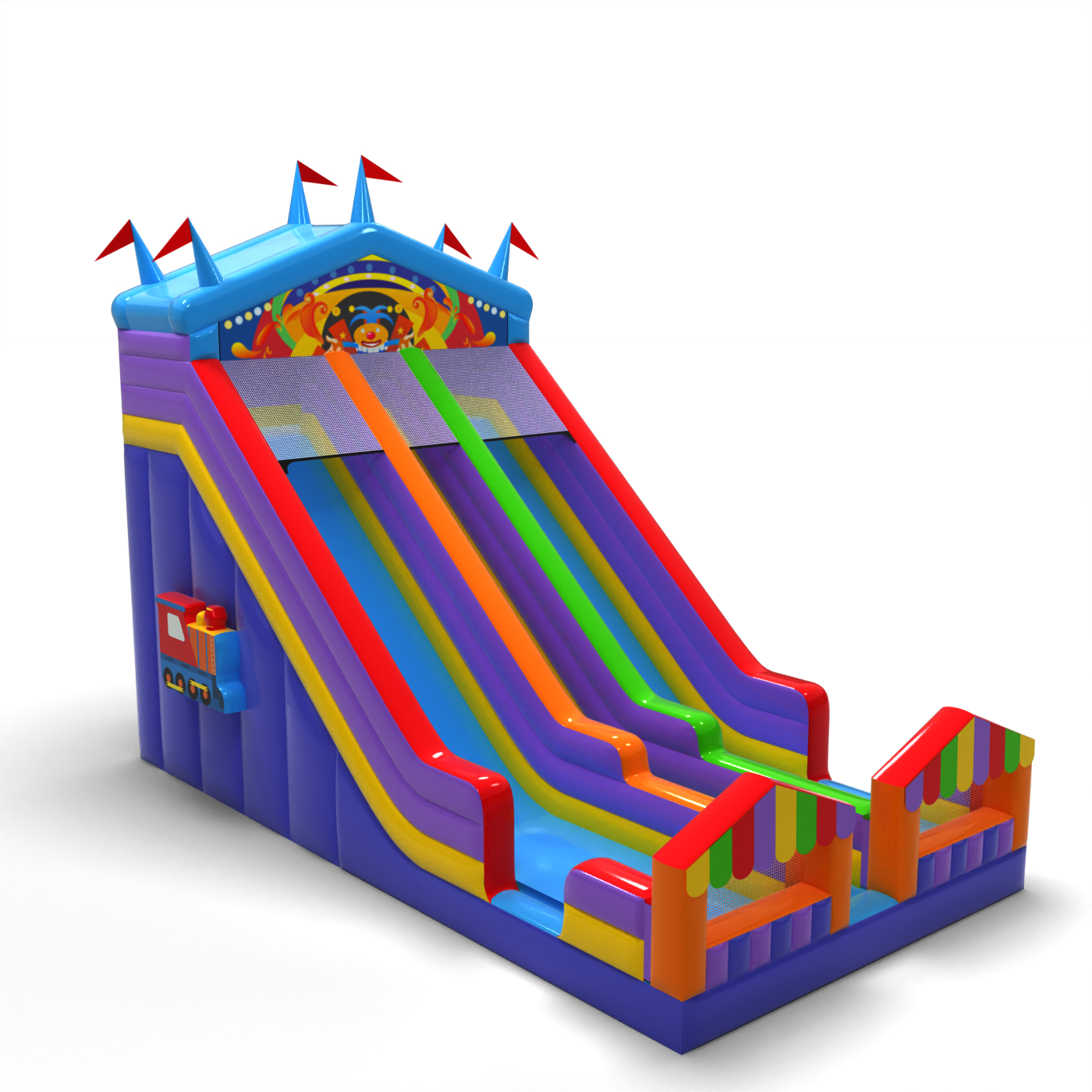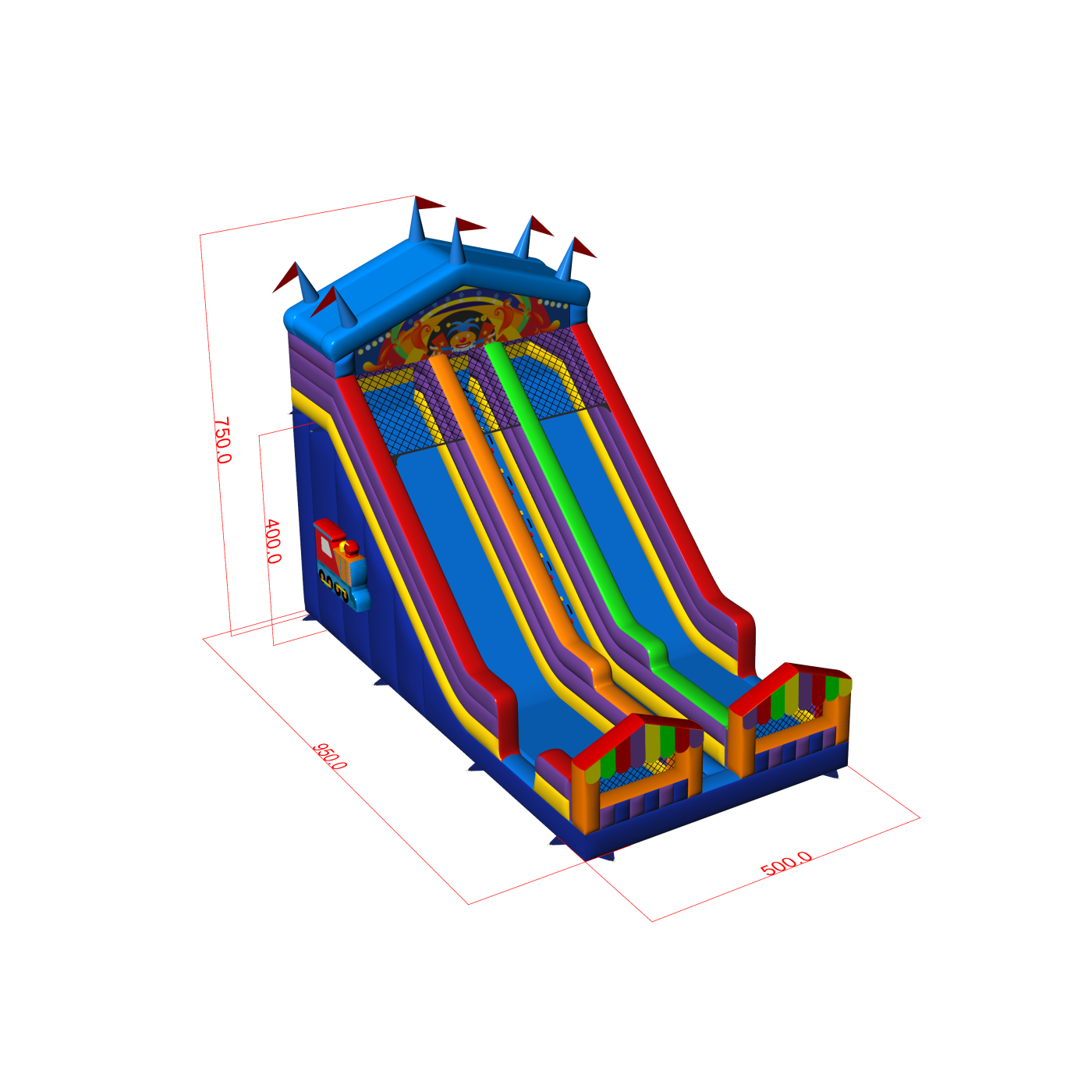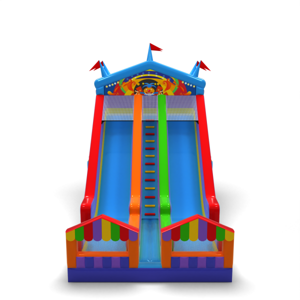 Podwójna powiększona zjeżdżalnia dmuchana w motywie wesołego miasteczka to fantastyczny dmuchaniec dla dzieci i młodzieży. Świetnie sprawdzi się w zestawie z naszymi pozostałymi atrakcjami w różnych motywach. Podwójna powiększona zjeżdżalnia dmuchana w motywie wesołego miasteczka wzbudza zainteresowanie dzieci, gdy tylko znajdzie się w zasięgu ich wzroku. Najmłodsi uczestnicy eventów przepadają za dobrą zabawą, dlatego ta zjeżdżalnia może być jednym z bardziej popularnych dmuchańców w Twojej ofercie. Dmuchańce z tej kategorii są efektowne, posiadają zwykle wiele zdobień i elementów, które zachęcają do podjęcia skocznej zabawy na świeżym powietrzu.