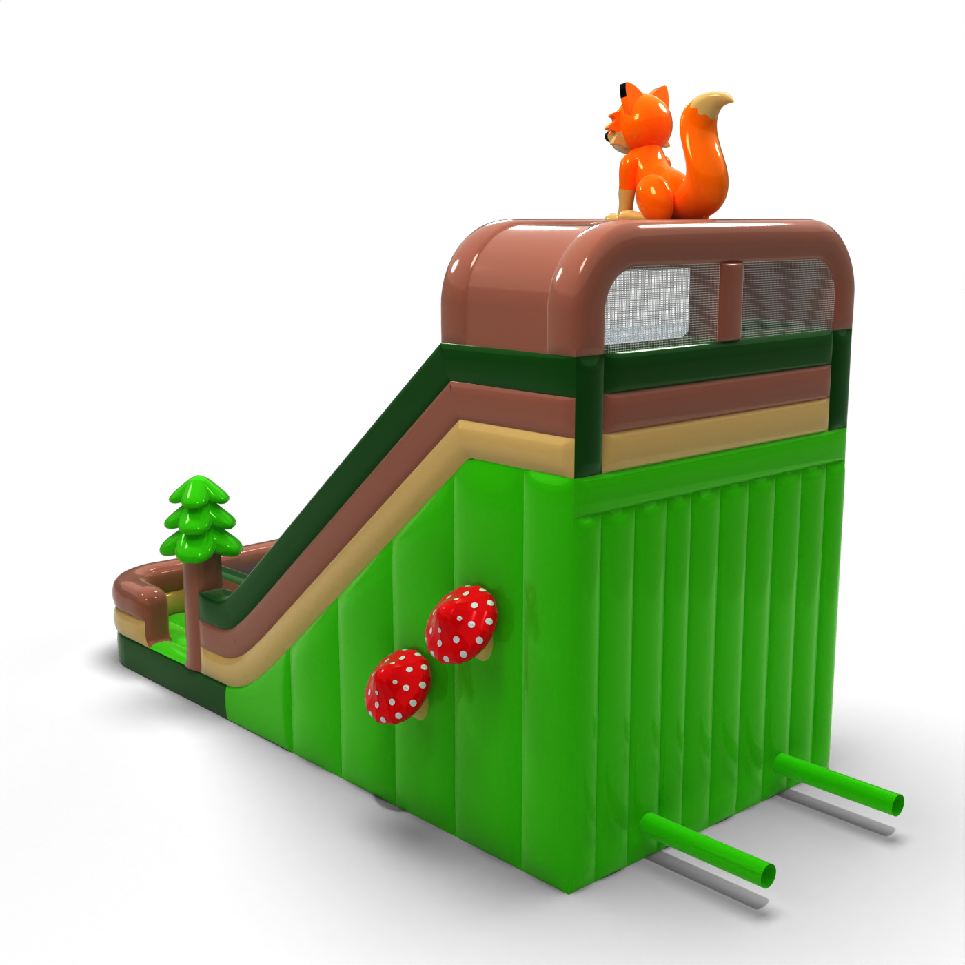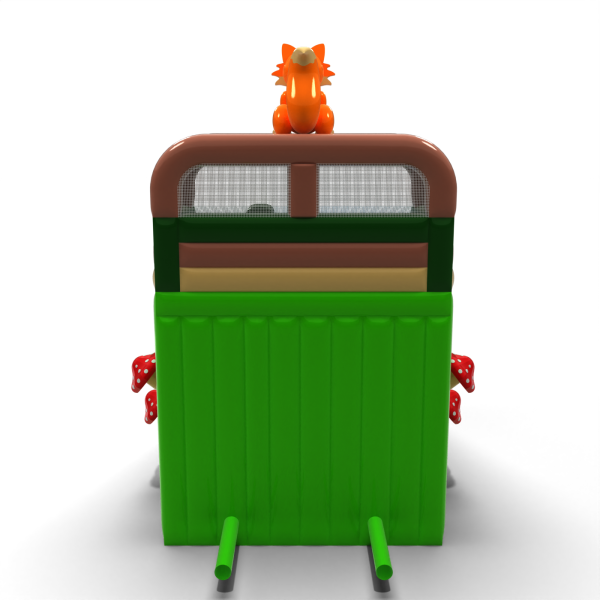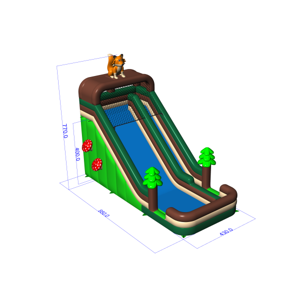 Zjeżdżalnia w stylu leśnym z dekoracjami w formie drzew, grzybów i sympatycznego lisa na szczycie to atrakcja, która doskonale komponuje się z zielonym otoczeniem wydarzeń plenerowych. Naturalna kolorystyka i wysoka konstrukcja zapewniają silny efekt wizualny oraz bezpieczną, dynamiczną zabawę. Model rekomendowany na imprezy o charakterze edukacyjnym, ekologicznym lub integracyjnym. Niezawodna opcja dla wypożyczalni i organizatorów dużych eventów rodzinnych.