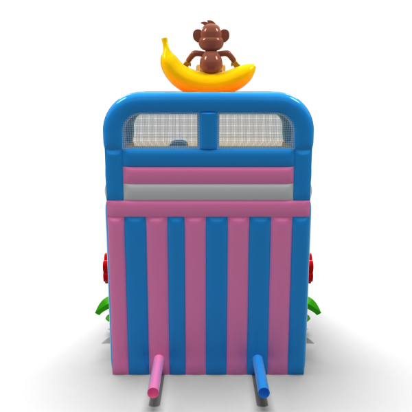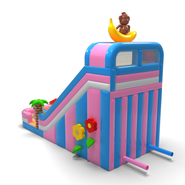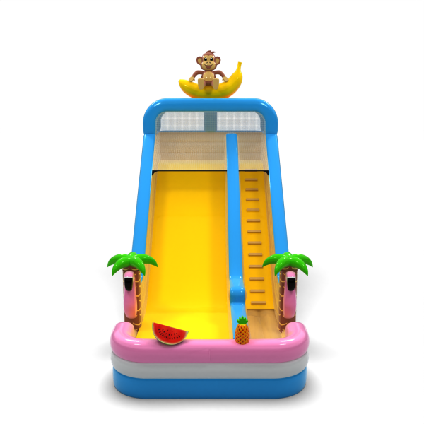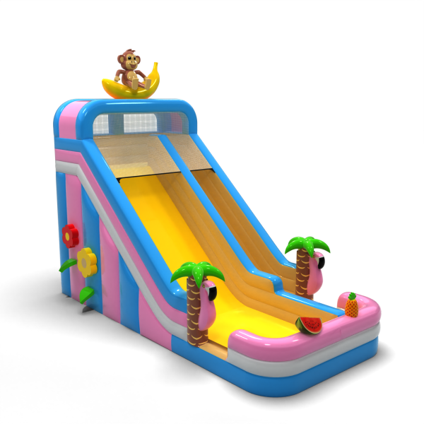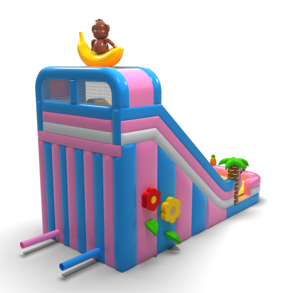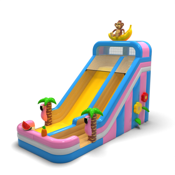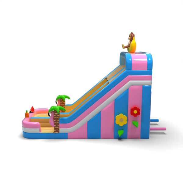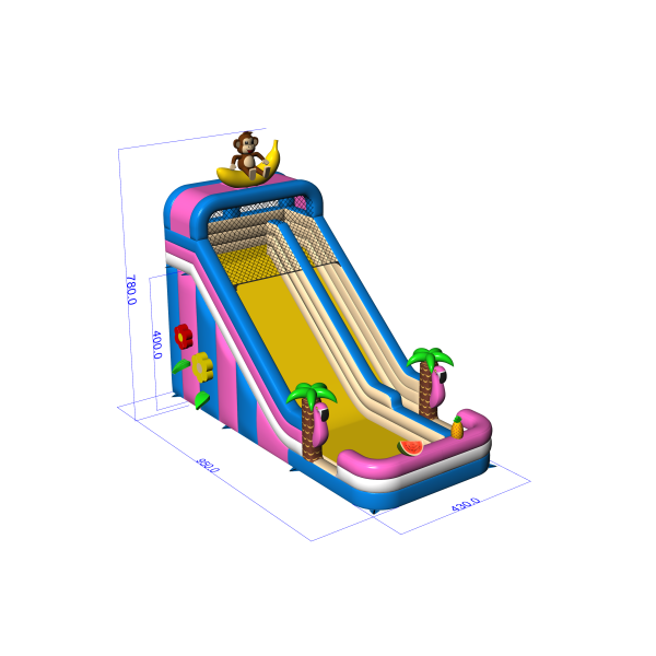Egzotyczna zjeżdżalnia z motywem hawajskim i figurką małpki na bananie to model, który od razu wyróżnia się wśród innych atrakcji. Jasne kolory, ozdobne palmy i elementy owocowe przyciągają uwagę dzieci i tworzą pozytywne skojarzenia. Szeroki zjazd umożliwia płynny ruch, co zwiększa jej wydajność podczas dużych wydarzeń. Doskonały wybór do oferty sezonowej lub tematycznej – na pikniki wakacyjne, beach party i letnie festyny.