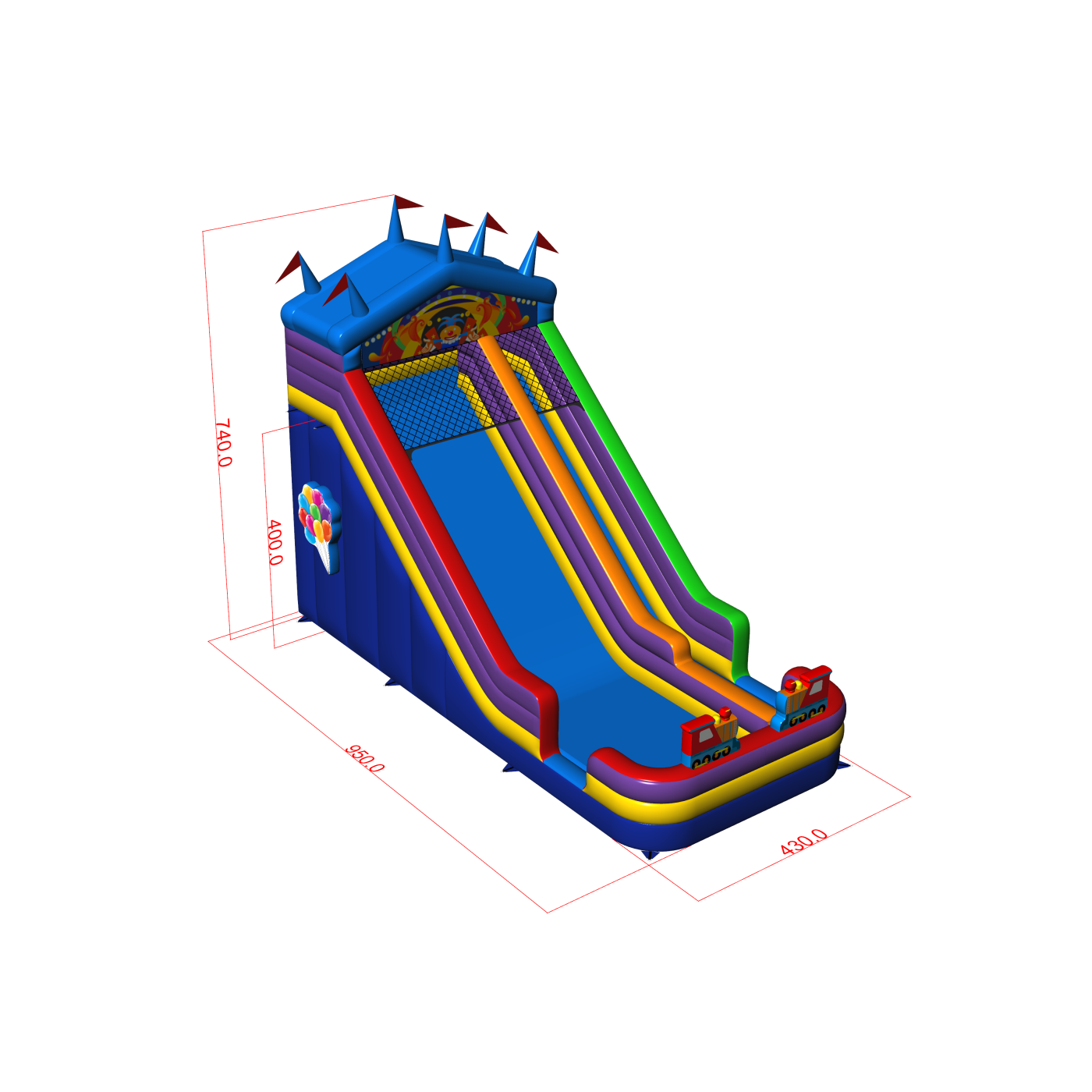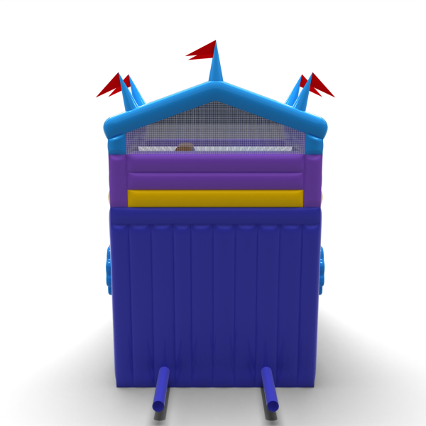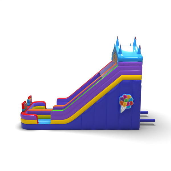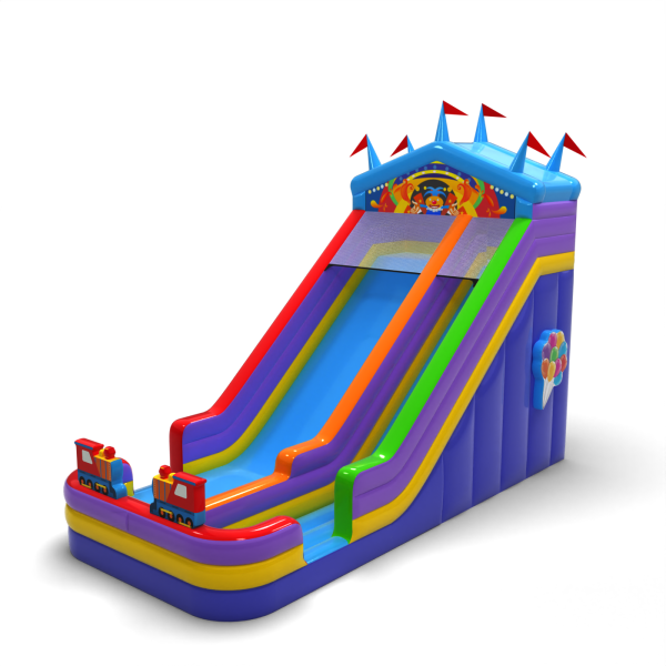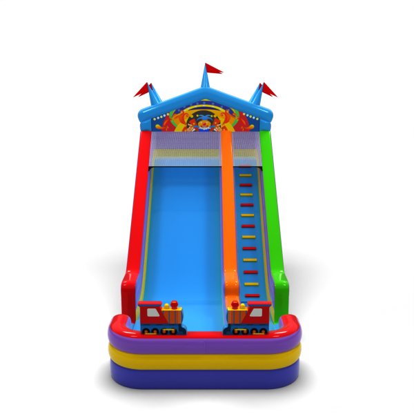 Kolorowa zjeżdżalnia stylizowana na namiot cyrkowy to uniwersalna atrakcja inspirowana klasycznym wesołym miasteczkiem. Jaskrawe kolory i dekoracyjny daszek sprawiają, że konstrukcja wyróżnia się na każdym wydarzeniu – od miejskich festynów po rodzinne pikniki. Dzięki dużej wysokości i szerokiemu zjazdowi zapewnia intensywną zabawę przez cały dzień. Idealna propozycja dla organizatorów szukających solidnego, przyciągającego wzrok modelu.