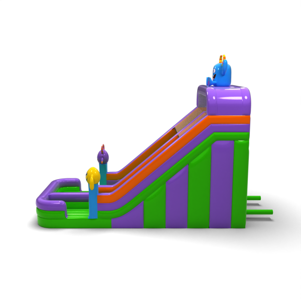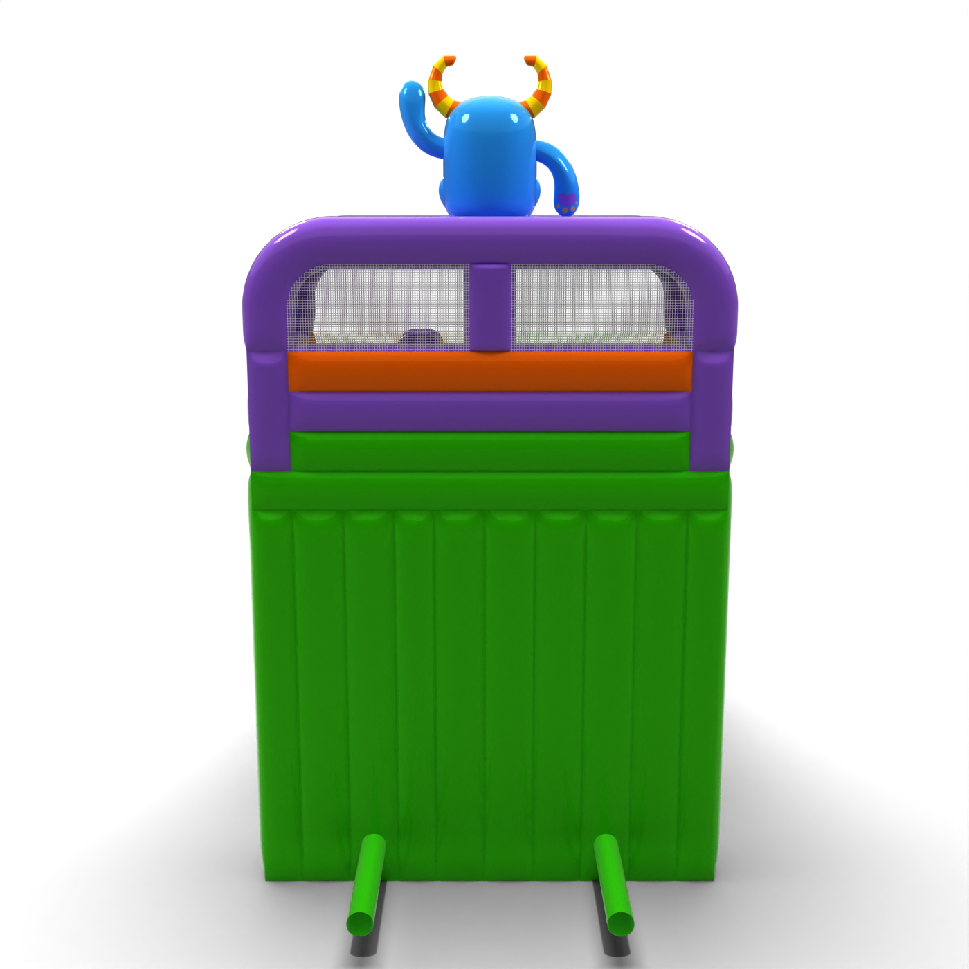 Zjeżdżalnia z figlarnym potworkiem na szczycie i bajkowymi dekoracjami to świetna propozycja dla najmłodszych uczestników eventów. Intensywna kolorystyka i charakterystyczne postacie dodają konstrukcji energii i przyjaznego wyglądu. Szeroka powierzchnia zjazdu pozwala na dynamiczną zabawę, a neutralny motyw pasuje do wielu okazji – od festynów po animacje w centrach handlowych.