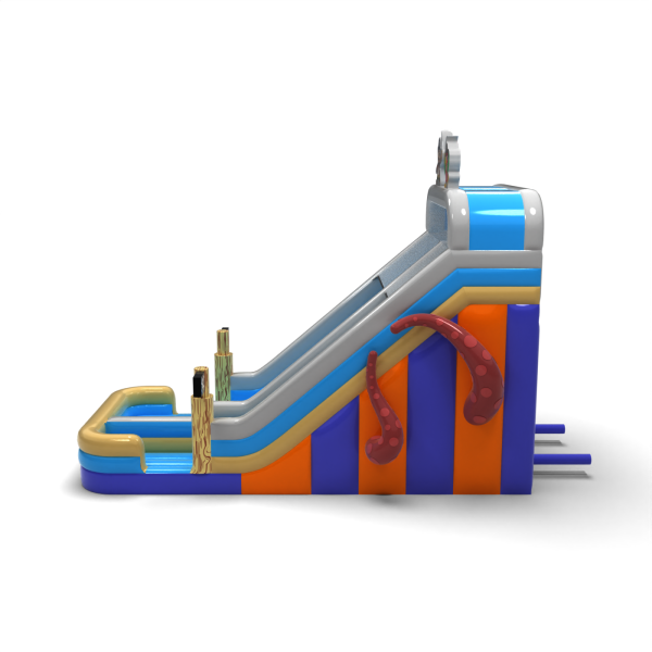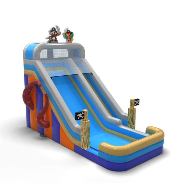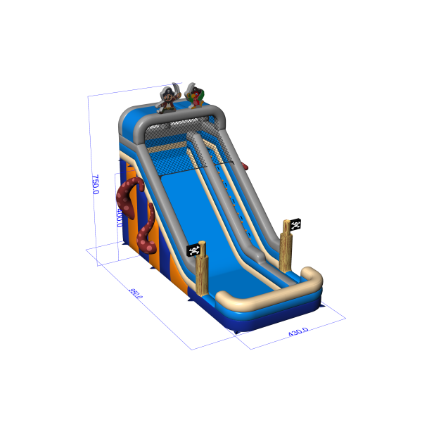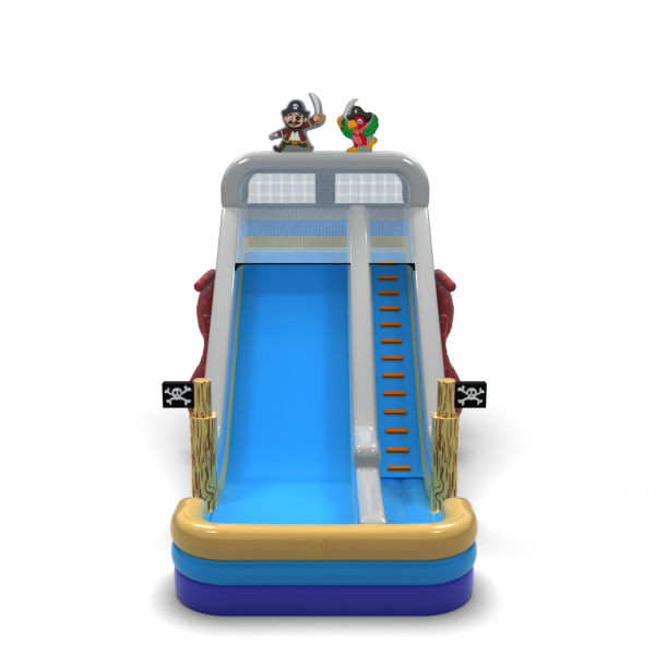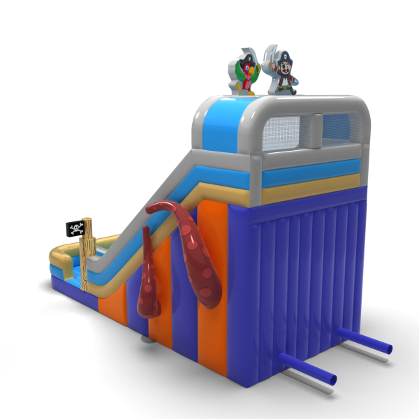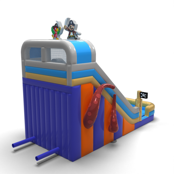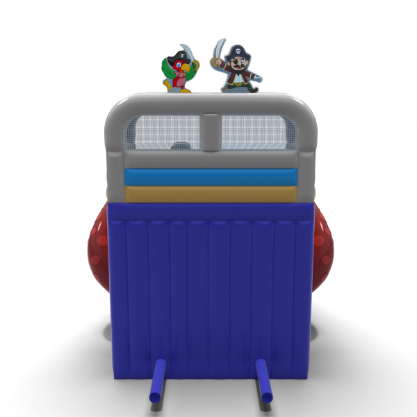 Zjeżdżalnia w pirackim stylu z charakterystycznymi postaciami i dekoracjami statku to idealna atrakcja na eventy tematyczne i letnie imprezy plenerowe. Kolorystyka w odcieniach błękitu i beżu nawiązuje do morskich przygód, a ozdobne detale, takie jak flagi i ośmiornica, podkreślają klimat zabawy. Konstrukcja zapewnia płynny zjazd i świetnie sprawdza się w intensywnej eksploatacji eventowej.