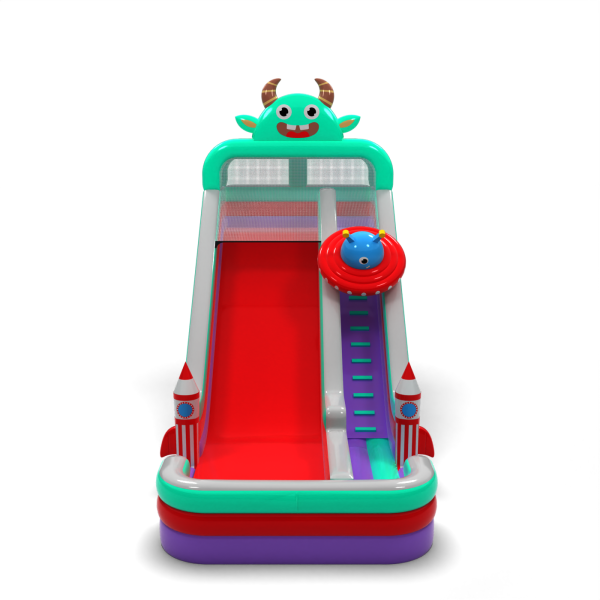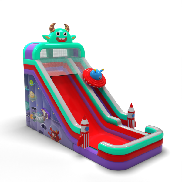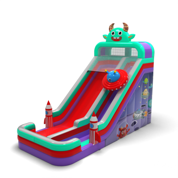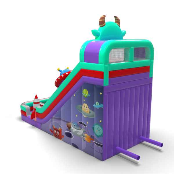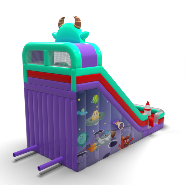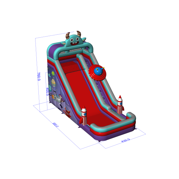 Nowoczesna zjeżdżalnia z motywem kosmicznym, ufoludkiem i rakietami to konstrukcja, która wyróżnia się dynamicznym designem i przyciąga uwagę najmłodszych. Przestrzenna grafika boczna, dekoracyjne elementy 3D i wysoki tor zjazdowy gwarantują dużą frekwencję podczas eventów. To propozycja dla firm szukających atrakcji, która wpisuje się w futurystyczne scenariusze imprez lub edukacyjne pikniki naukowe.