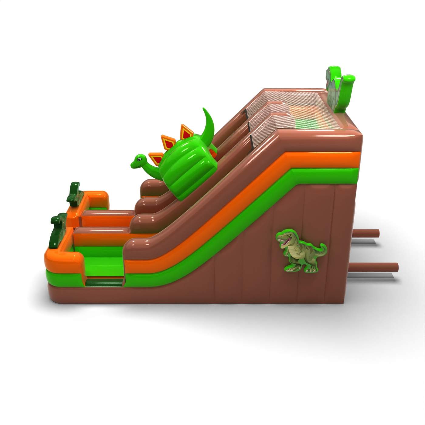 Forma otwartej paszczy dinozaura tworzy mocny, przygodowy efekt wizualny, który natychmiast przyciąga uwagę uczestników wydarzenia. Zjazd poprowadzony przez paszczę wzmacnia emocje zabawy i daje dzieciom poczucie uczestnictwa w jurajskiej przygodzie. Wyrazista, trójwymiarowa konstrukcja wyróżnia atrakcję na tle klasycznych zjeżdżalni i buduje jej rozpoznawalność. To nietypowy produkt dla wypożyczalni szukających czegoś, co realnie odróżni ofertę od standardowych dmuchańców. Atrakcja idealnie sprawdzi się na festynach, eventach tematycznych i dużych imprezach plenerowych, gdzie kluczowe są widowiskowość i silne wrażenie wizualne.