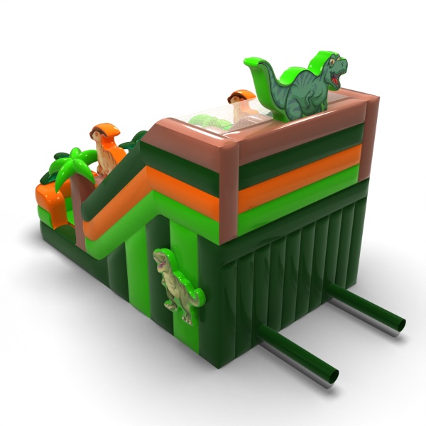 Kompaktowa zjeżdżalnia w dinozaurowej stylistyce łączy wyraźny efekt wizualny z formą dopasowaną do mniejszych przestrzeni eventowych. Dwa równoległe tory zjazdowe pozwalają dzieciom bawić się jednocześnie, zwiększając płynność zabawy i skracając czas oczekiwania. Jurajski klimat buduje poczucie przygody i sprawia, że atrakcja szybko przyciąga uwagę najmłodszych uczestników. Mniejszy format czyni ten model praktycznym wyborem dla wypożyczalni obsługujących krótsze realizacje i kameralne wydarzenia. Atrakcja sprawdzi się na festynach lokalnych, piknikach rodzinnych i animacjach plenerowych, gdzie liczy się mobilność, dynamika i rozpoznawalny motyw.