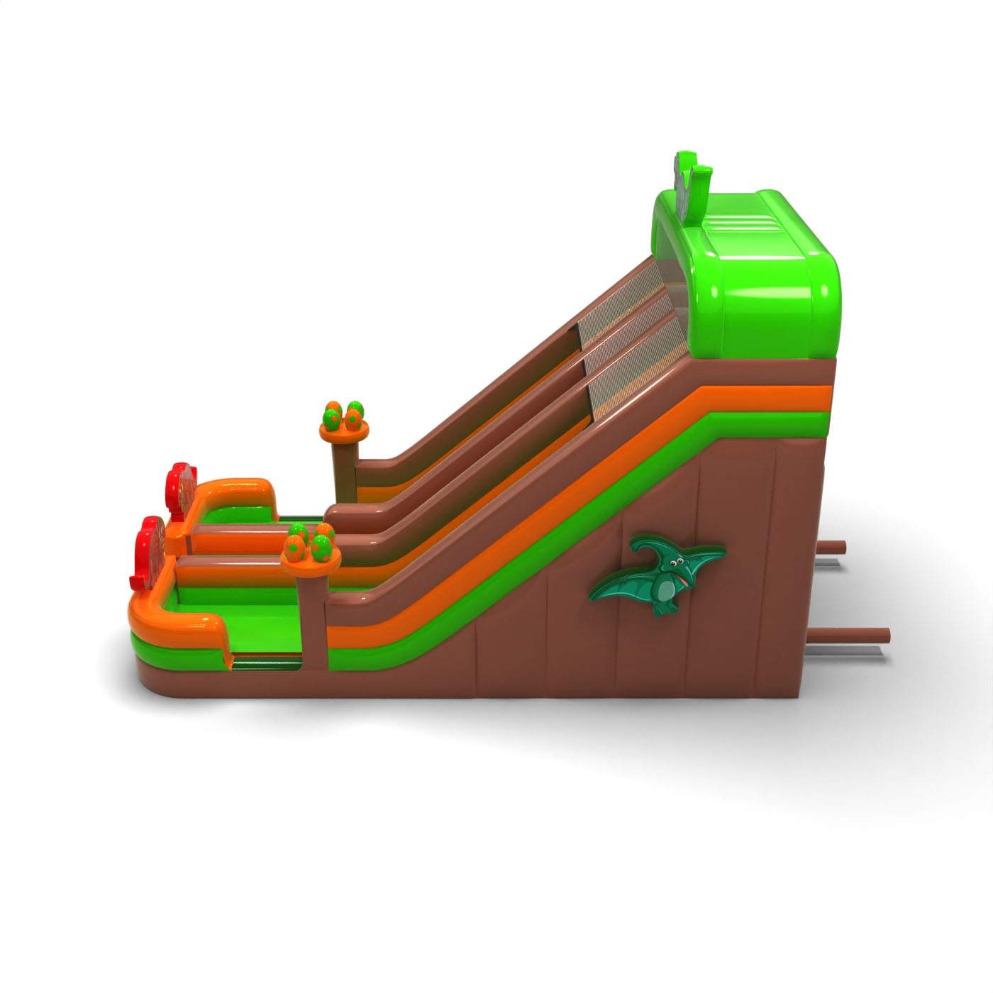 Imponująca wysokość i rozbudowana forma tworzą efektowną, jurajską atrakcję, która staje się jednym z głównych punktów wydarzenia. Dwa długie tory zjazdowe zapewniają intensywną zabawę i pozwalają obsłużyć dużą liczbę uczestników bez przestojów. Powiększona skala przekłada się na silne wrażenia wizualne i wyraźne poczucie „dużej atrakcji”, cenione na większych eventach. To propozycja dla wypożyczalni i agencji eventowych stawiających na sprzęt o wysokim potencjale zarobkowym i szerokim zastosowaniu. Atrakcja doskonale sprawdzi się na festiwalach, dniach miasta i dużych imprezach plenerowych, gdzie liczy się skala, widoczność i ciągły ruch uczestników.