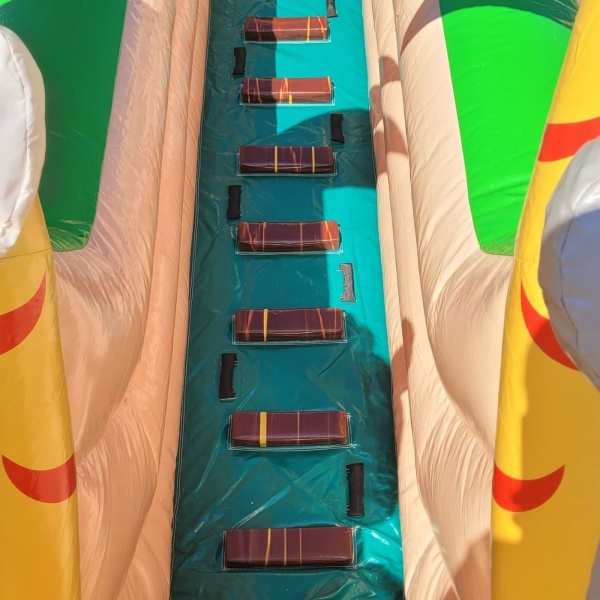 Podwójna dmuchana zjeżdżalnia z motywem dżungli pozwala obsłużyć większą liczbę uczestników i zwiększa atrakcyjność strefy zabaw. Dmuchaniec był użytkowany w standardowych warunkach eventowych. Stan atrakcji jest dobry, z normalnymi śladami użytkowania widocznymi na zdjęciach. Produkt nadaje się do dalszego komercyjnego wykorzystania jako pełnowartościowa atrakcja eventowa. Po więcej informacji, zdjęć i nagrań produktu prosimy o kontakt.